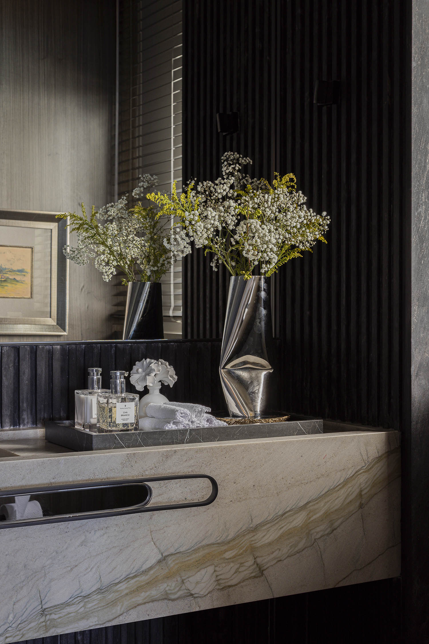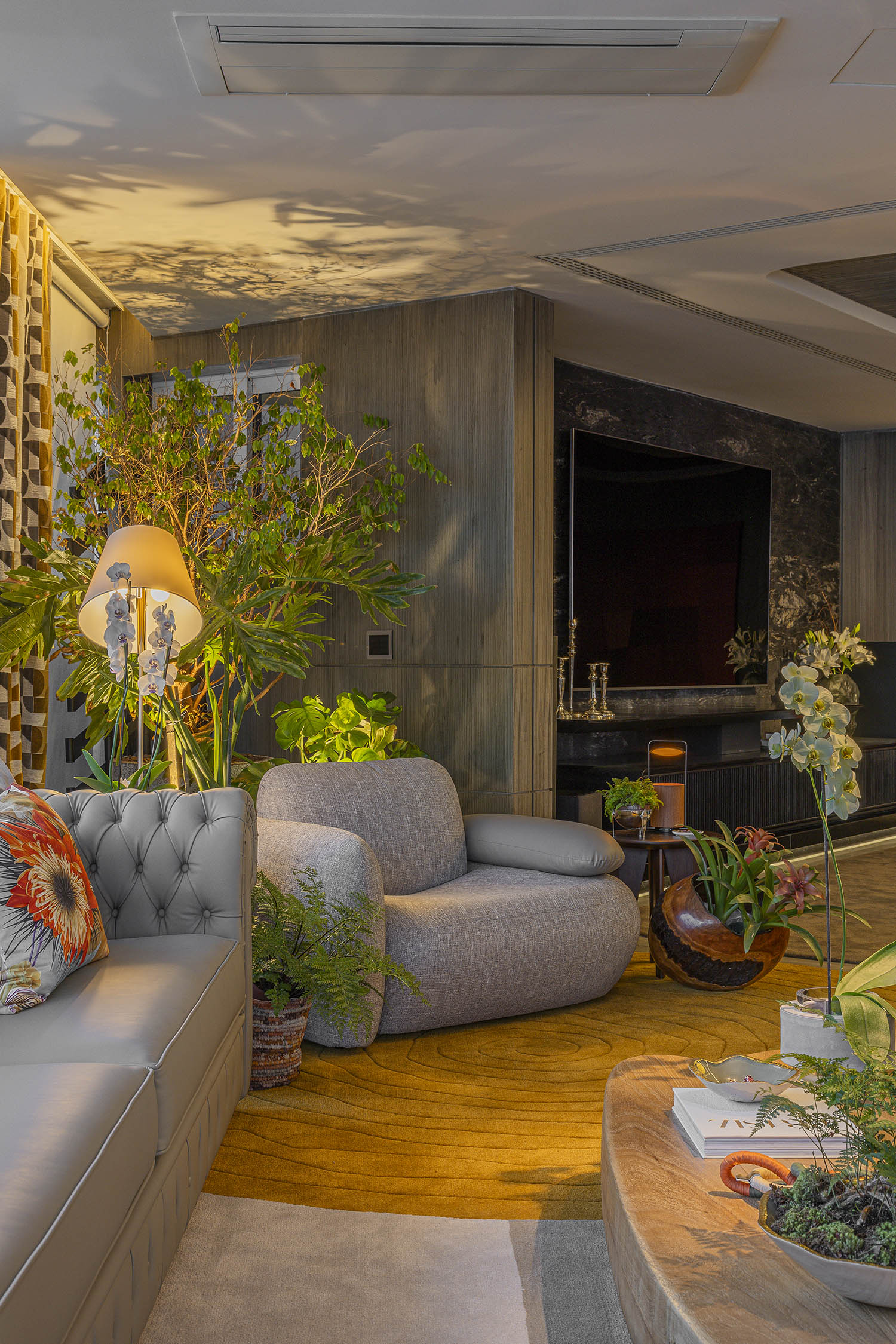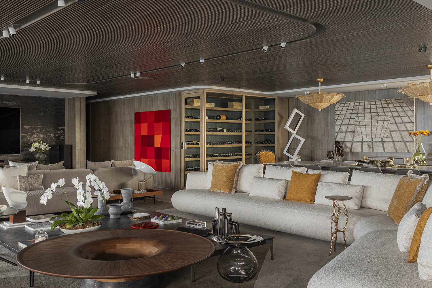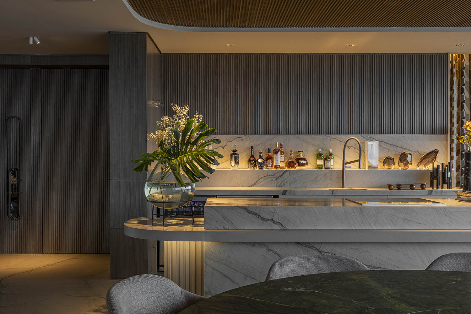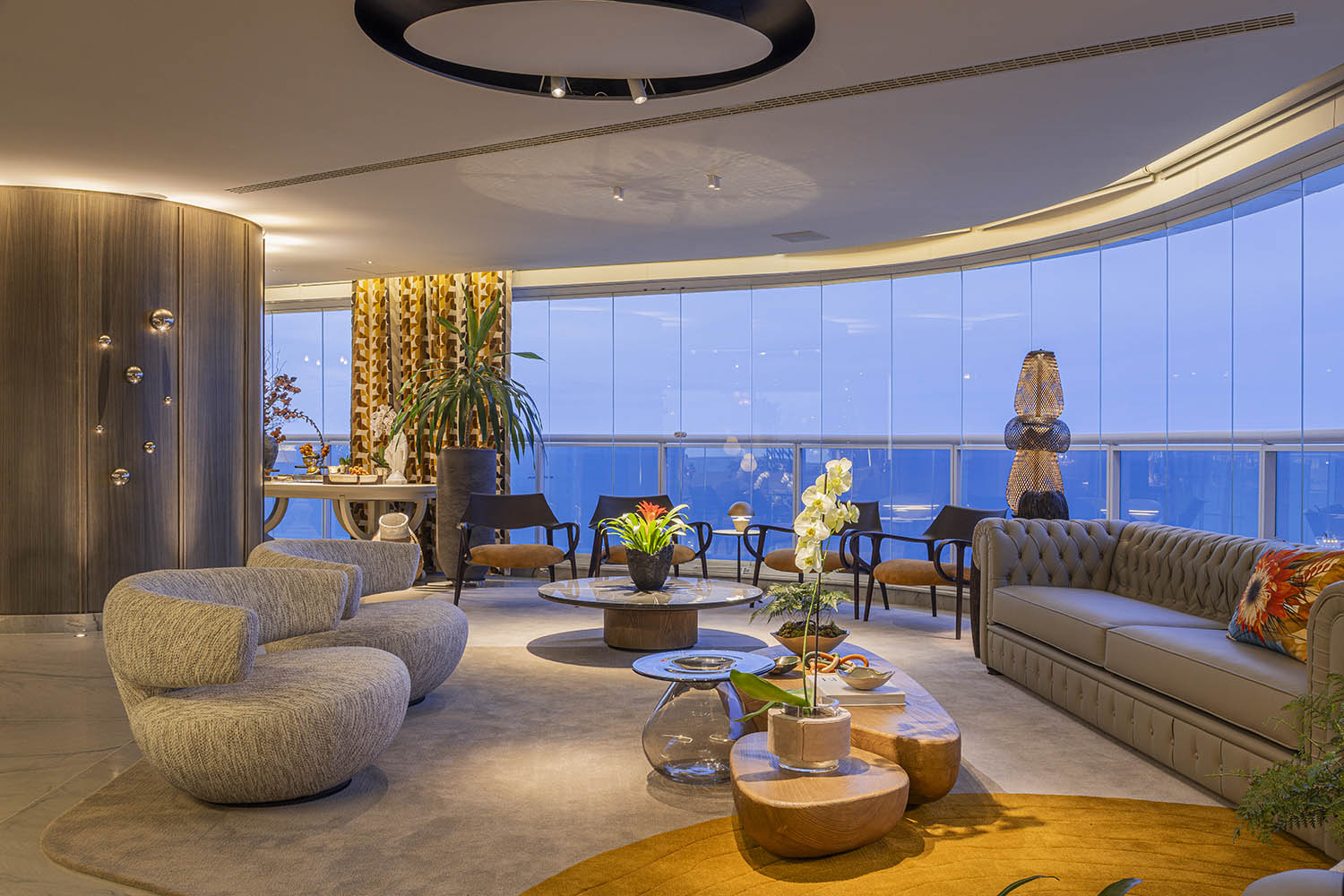 Os encontros são a alma da casa. As áreas sociais se estendem sem barreiras rígidas, favorecendo fluxos leves entre estar, jantar e cozinha. Cidade e oceano moldam a luz, a paleta e a experiência dos ambientes. Materiais naturais criam uma base neutra: madeira no teto aquece, pedra nas paredes ancora o olhar.