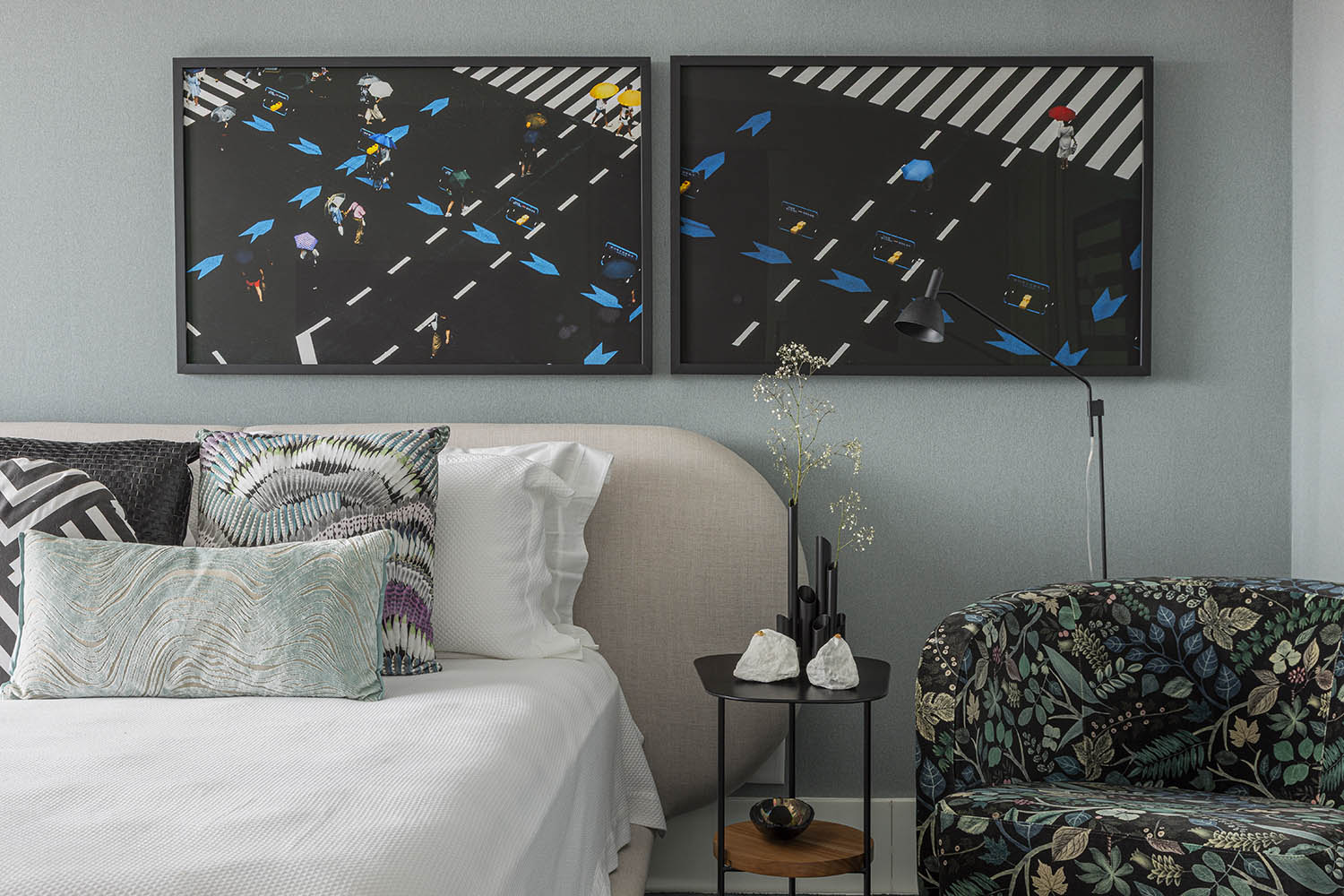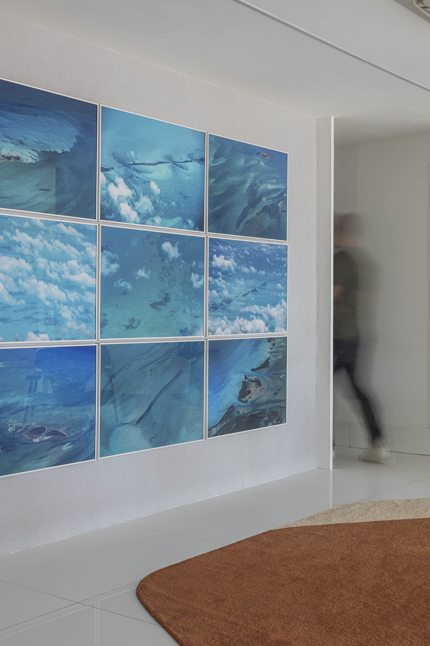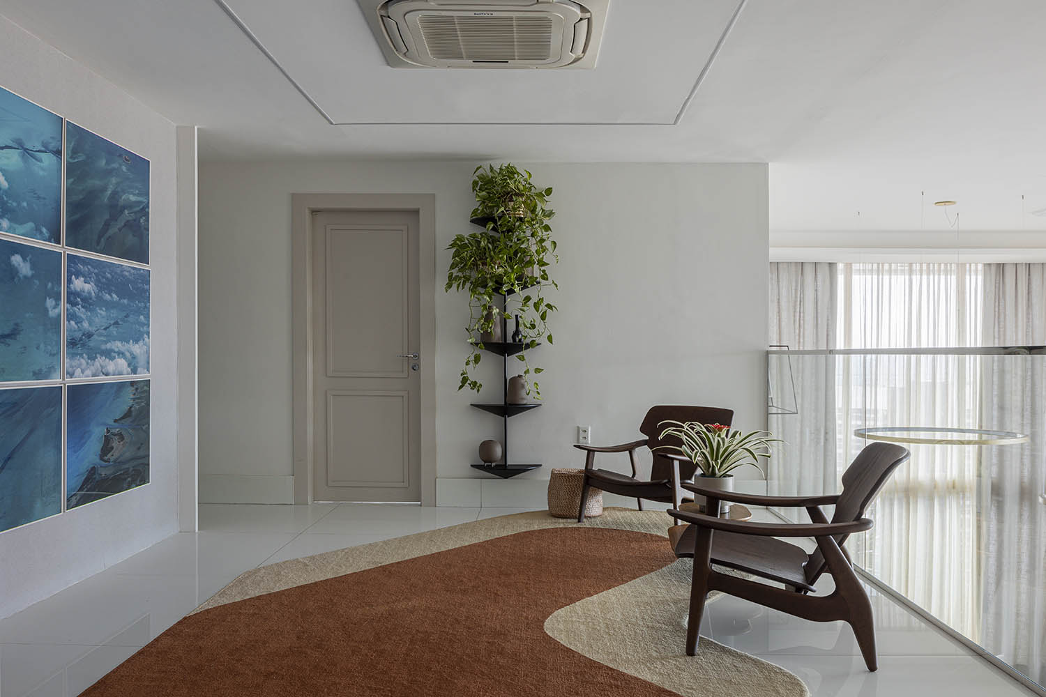 A arquitetura, serena e contida, abre espaço para que a arte e a paisagem conduzam a experiência. A vista da orla da Beira Mar, revelada entre o skyline, é como uma pintura viva emoldurada pelas aberturas. A luz repousa sobre tons crus e texturas suaves. O mobiliário discreto valoriza o acervo da moradora, fotógrafa cearense. A arte não é ornamento: é estrutura e discurso.