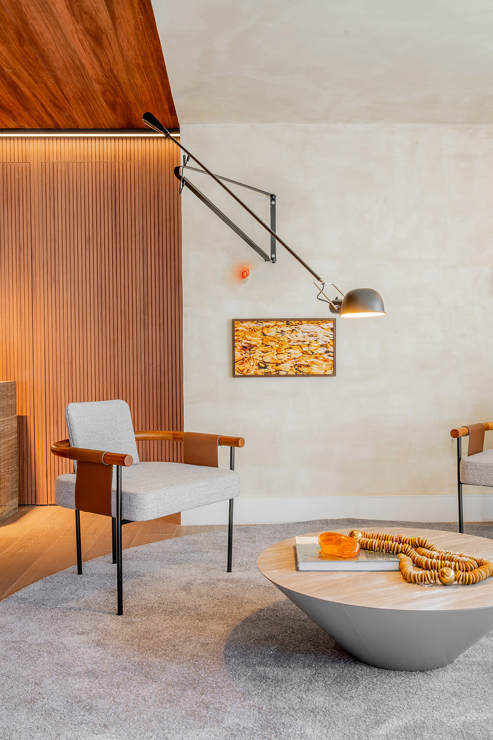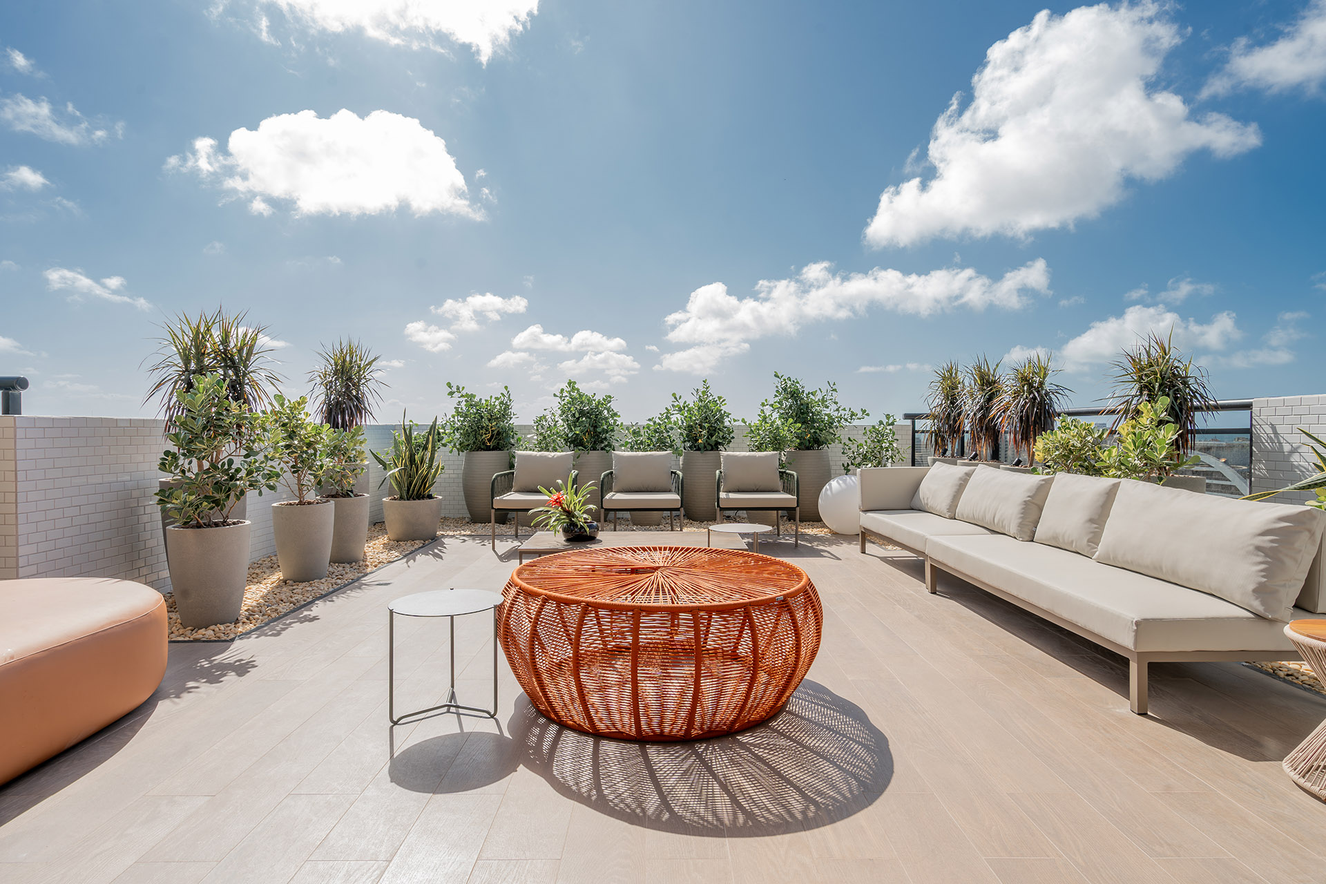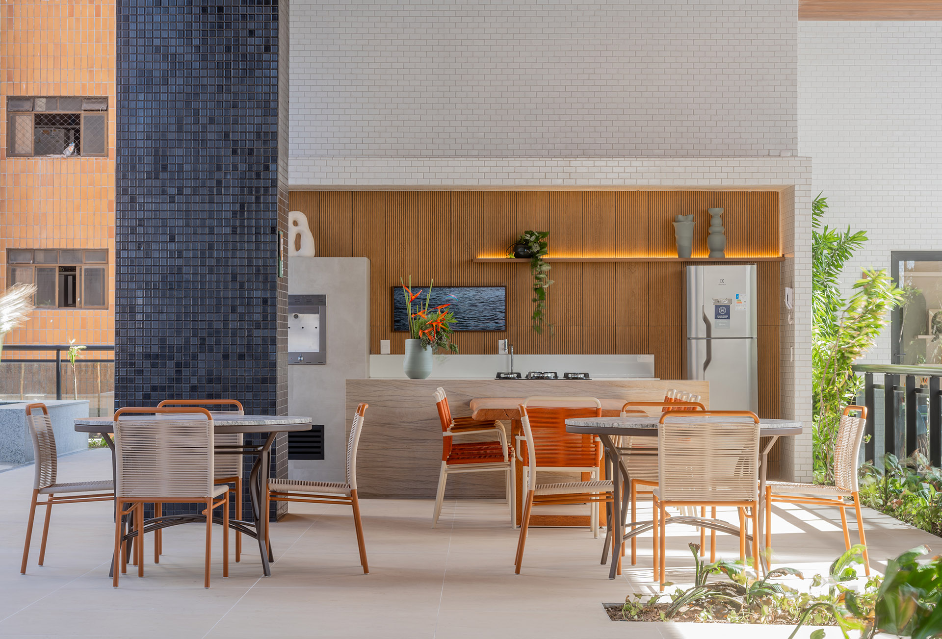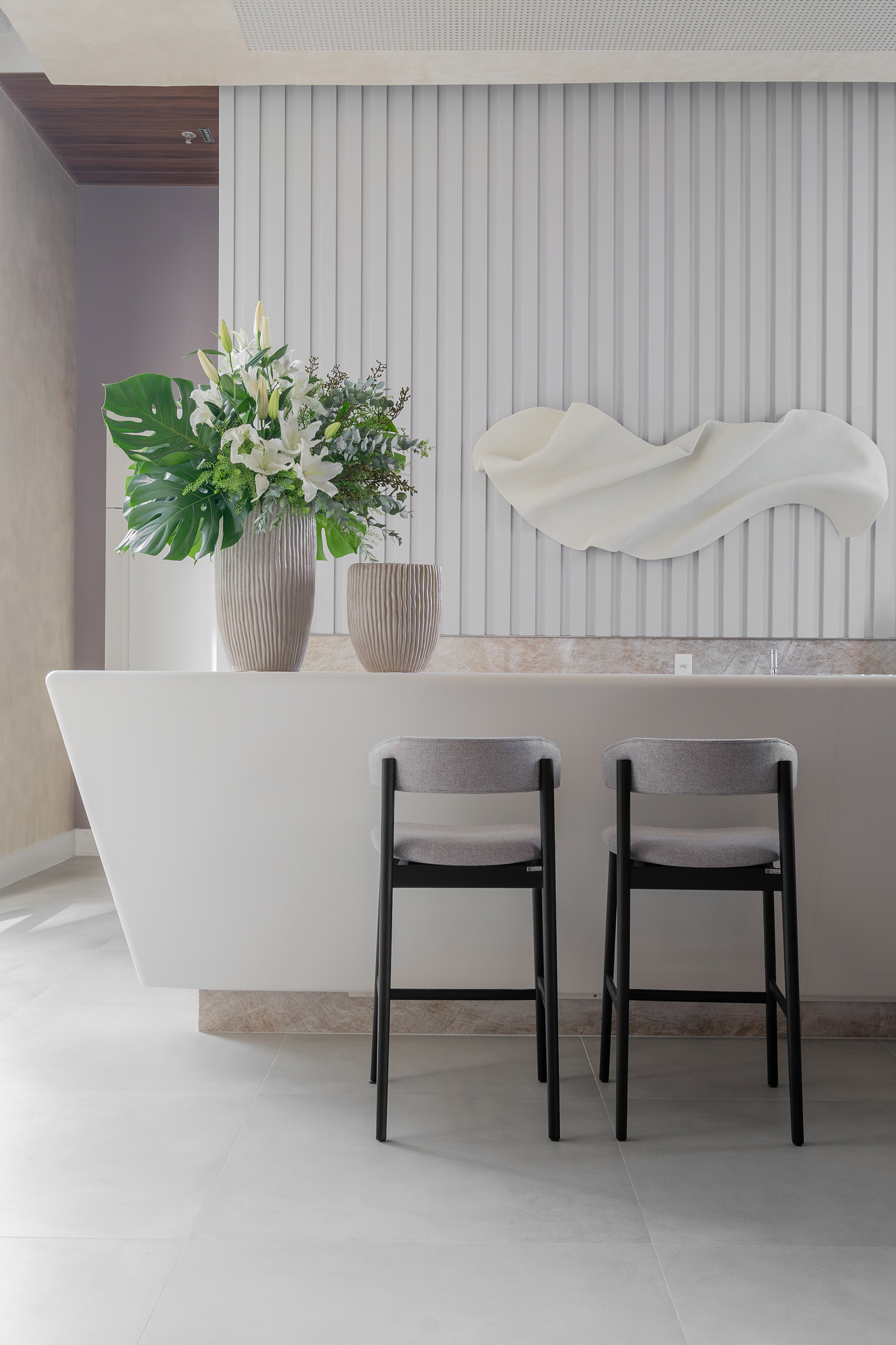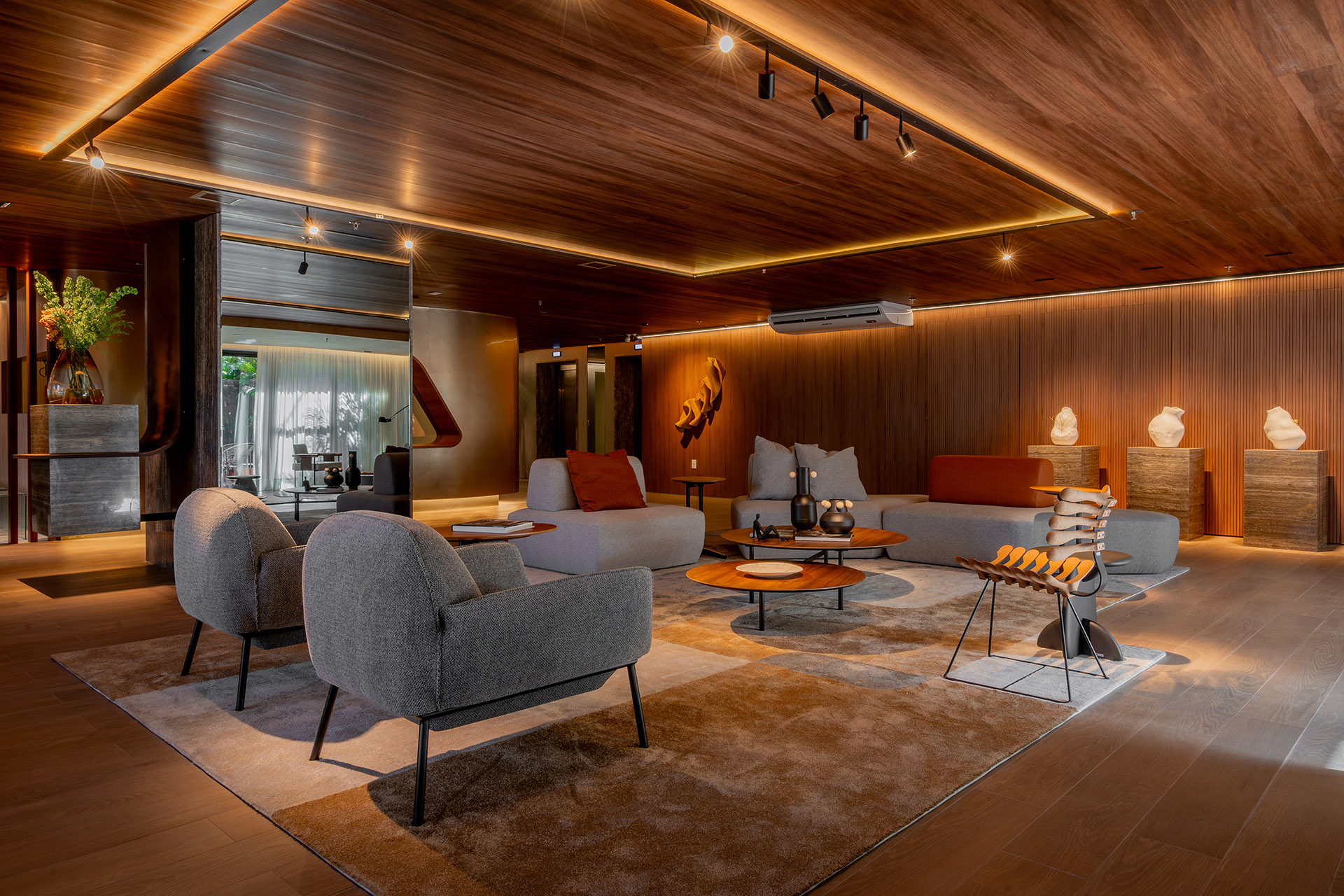 O projeto de interiores das áreas comuns do BS Flower foi planejado para refletir o conceito do empreendimento: charme. Inspirado pela atmosfera da Praça das Flores, o design remete a espaços públicos acolhedores, com materiais que dialogam com a vegetação e os passeios da região. A integração entre o natural e o construído cria ambientes que convidam à permanência e ao convívio.