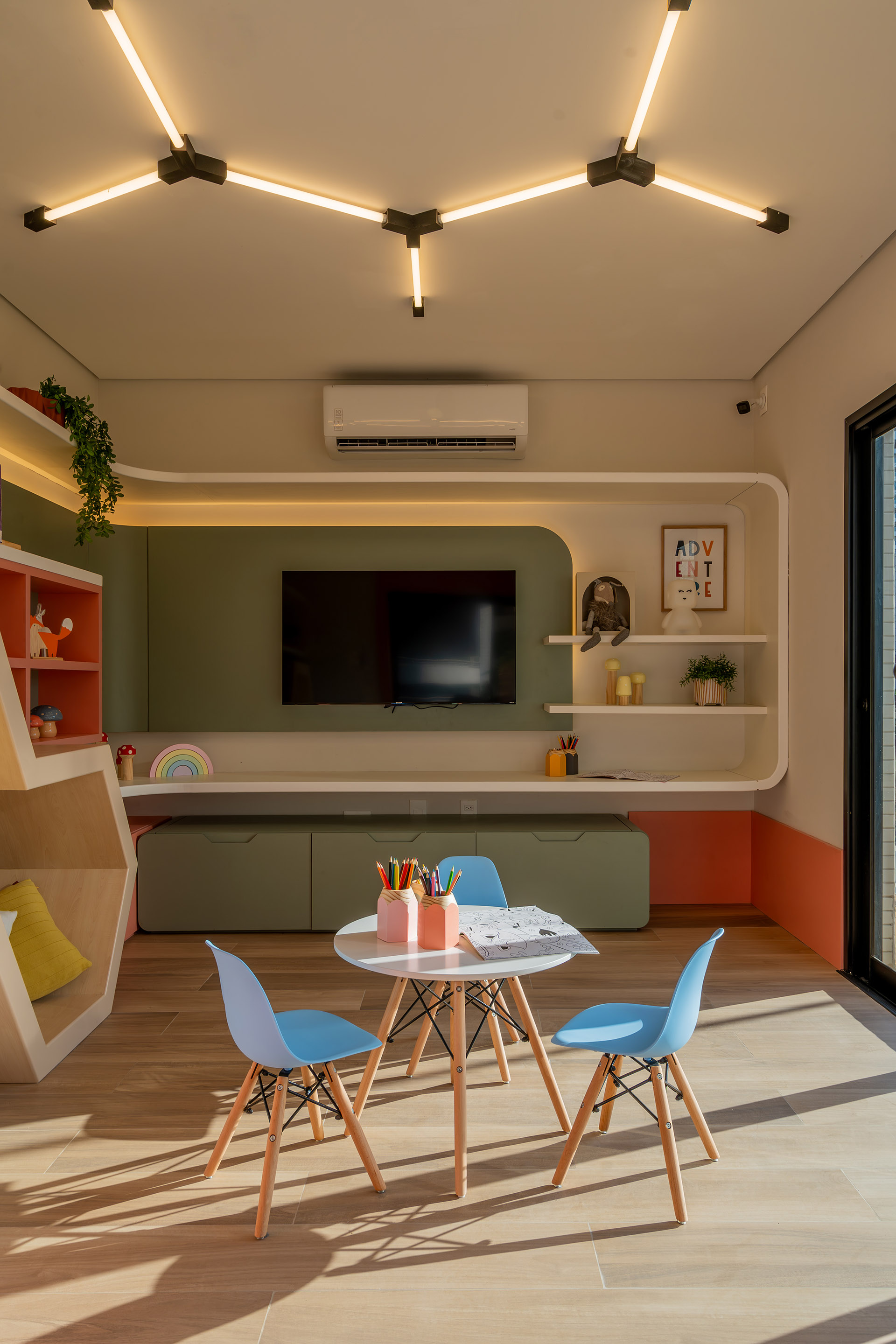 Distribuído em três pavimentos, o projeto se inicia no Térreo, onde a recepção tem ares de residência, transmitindo conforto e familiaridade logo na chegada. Esse espaço reforça o caráter acolhedor do edifício, com uma escala humana e delicada.