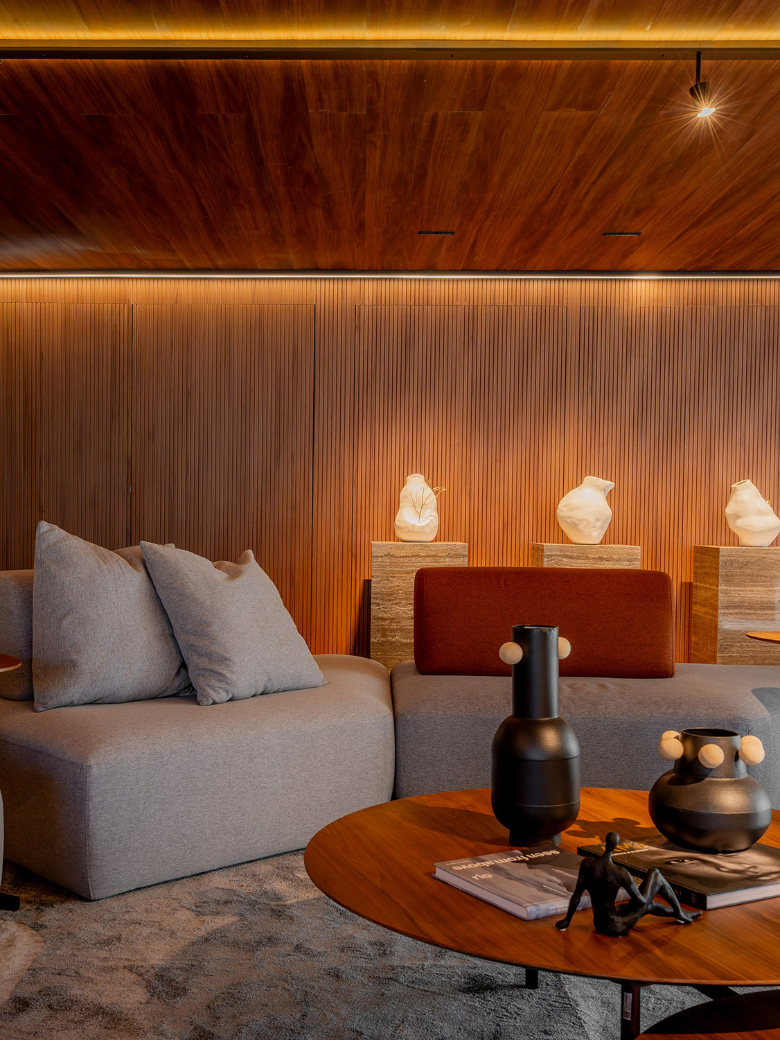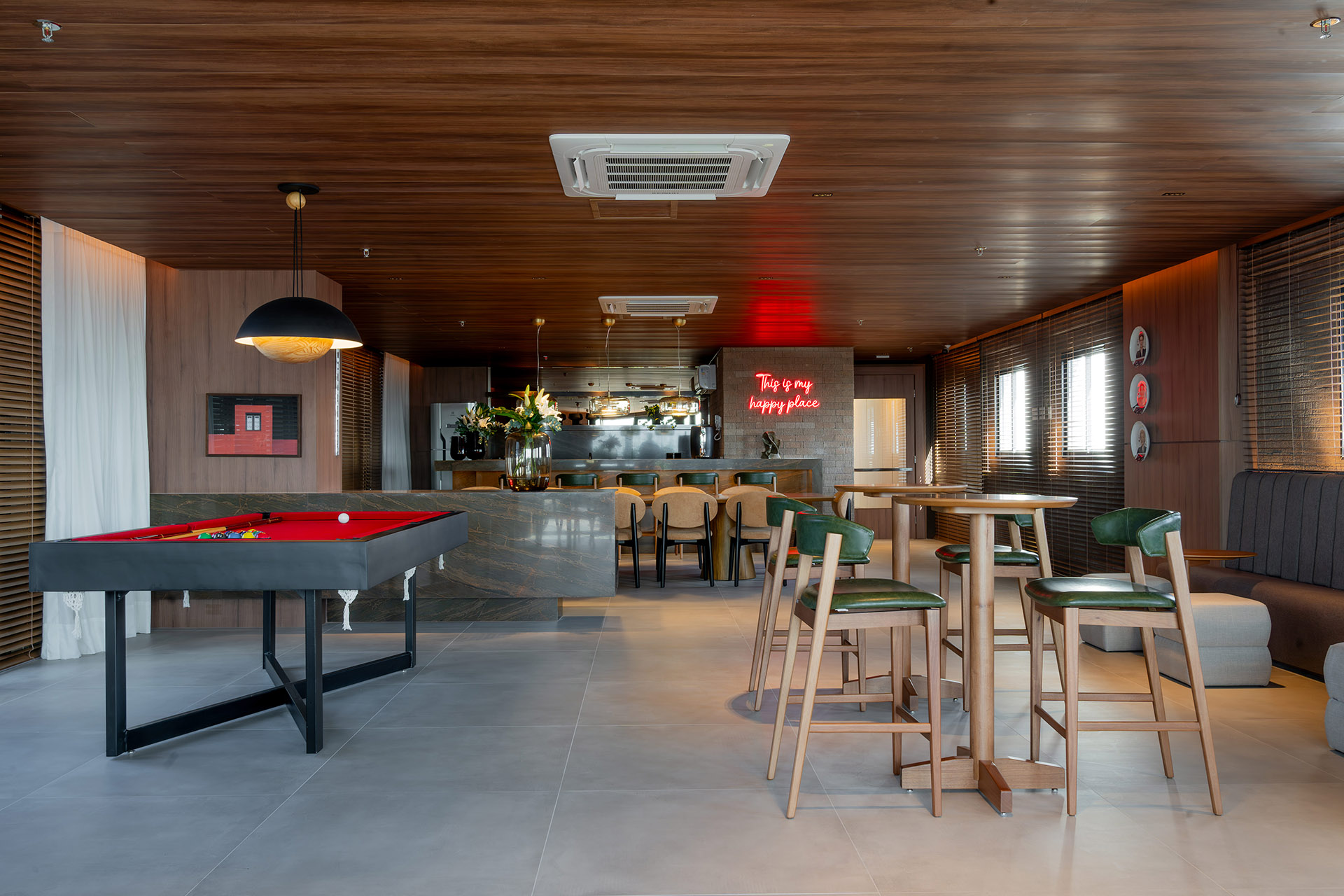 No pavimento SKY, dois espaços se destacam: a Academia, ampla e equipada, atende um público exigente; e o Pub Gourmet, com materialidade própria e integração ao rooftop, oferece uma vista deslumbrante da cidade. Esse ambiente funciona também como um segundo espaço de eventos, ampliando as possibilidades sociais do edifício.