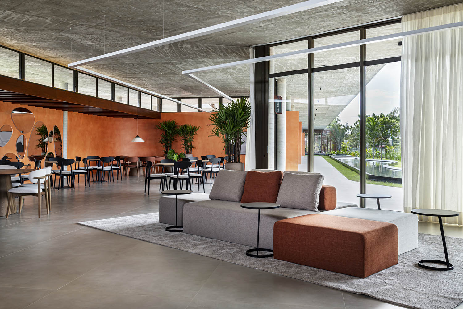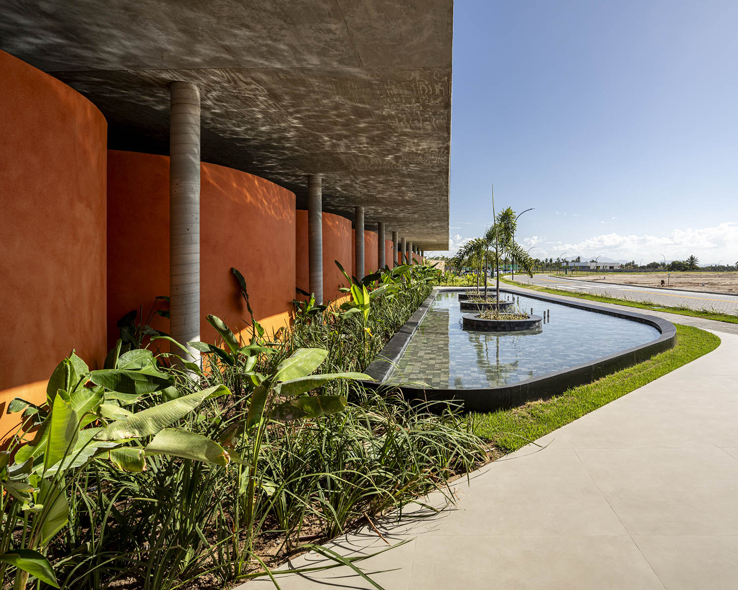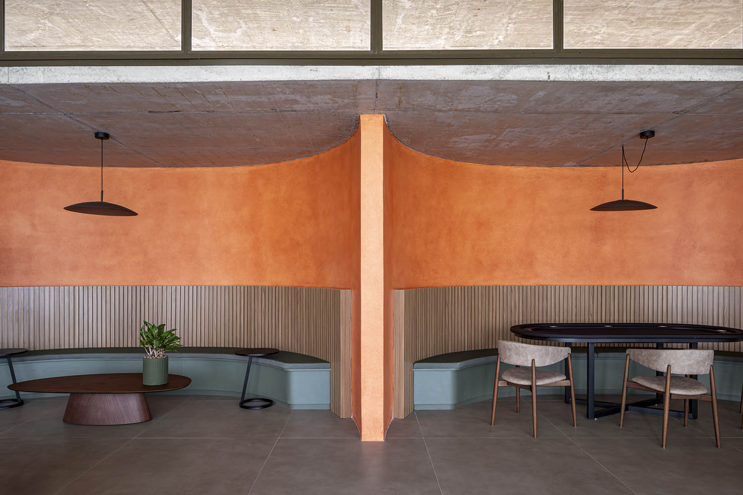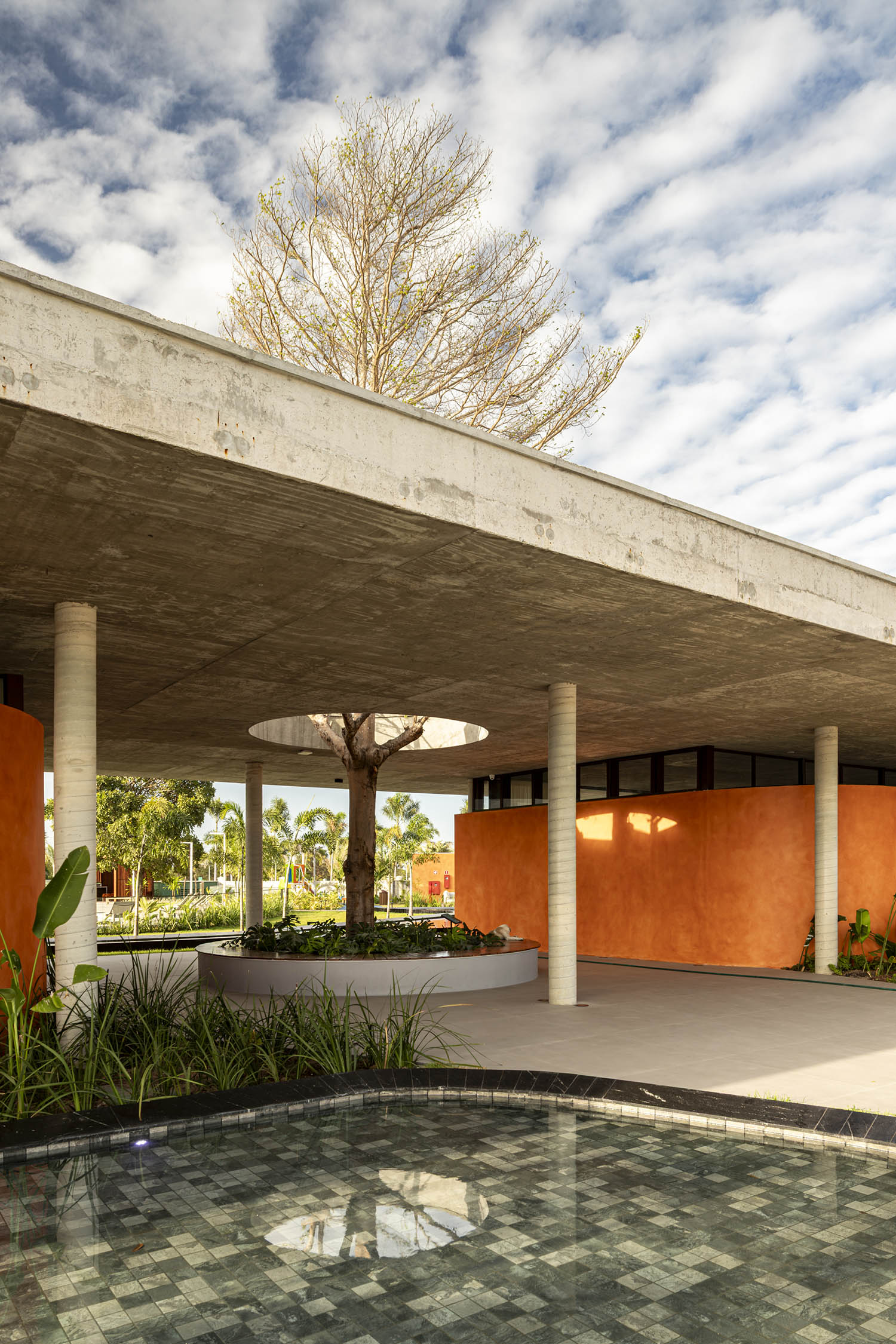 No clube, a laje em concreto aparente flutua sobre a própria massa. Sob ela, paredes sinuosas costuram os pilares, unindo vedação e estrutura. A cor terrosa evoca o solo nordestino e reforça o vínculo com a paisagem. A arquitetura se abre para a piscina de traços orgânicos, dissolvendo limites físicos e visuais. A transparência integra os interiores à paisagem.