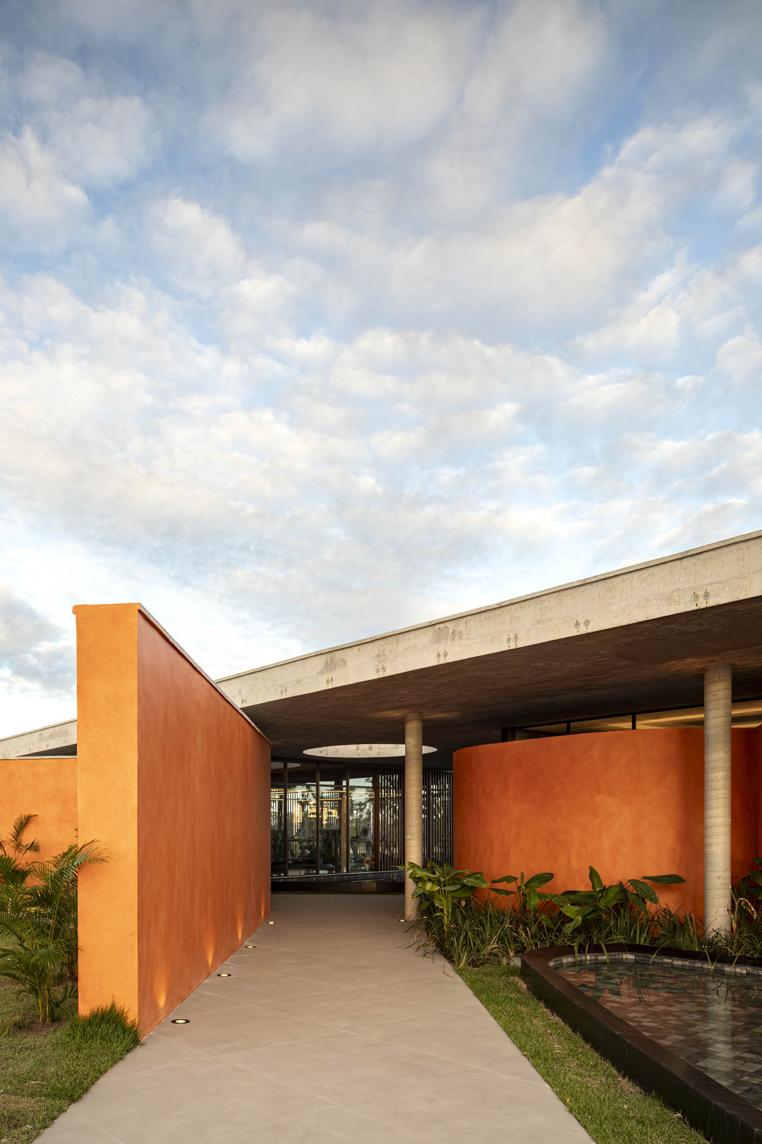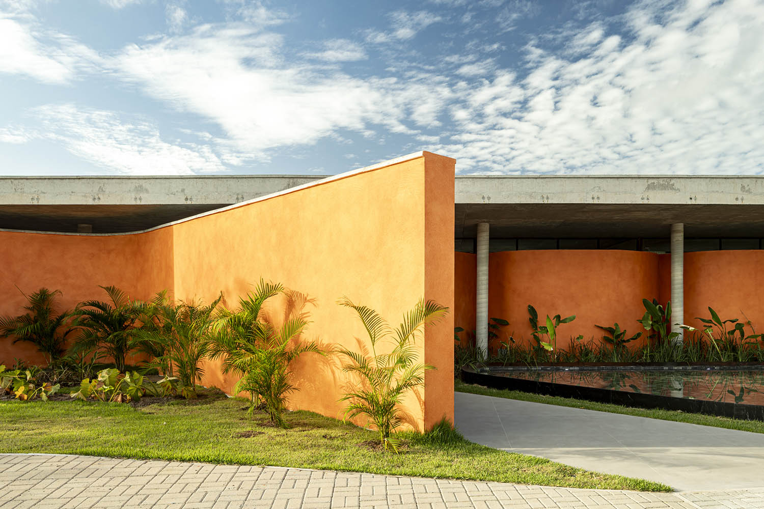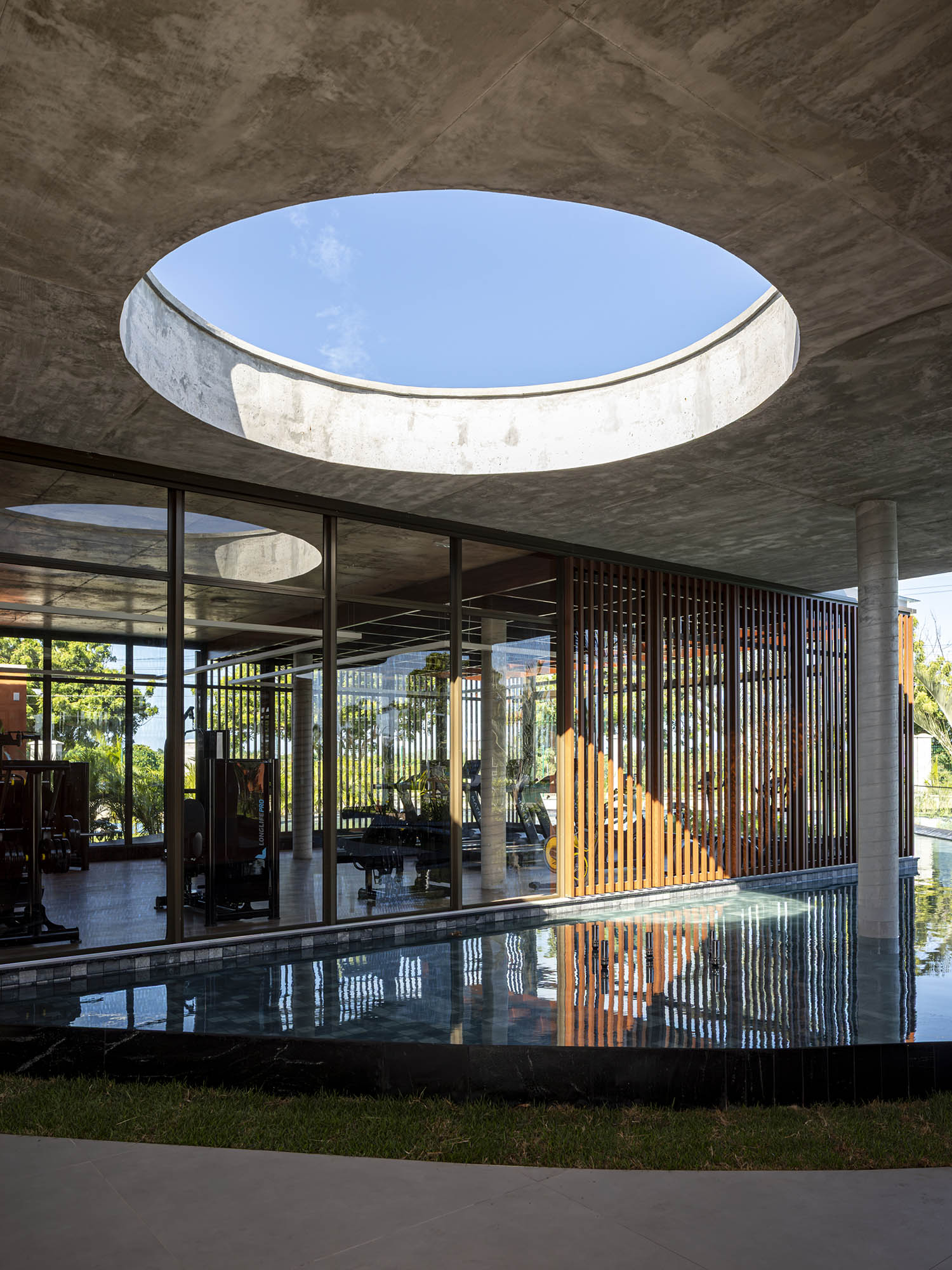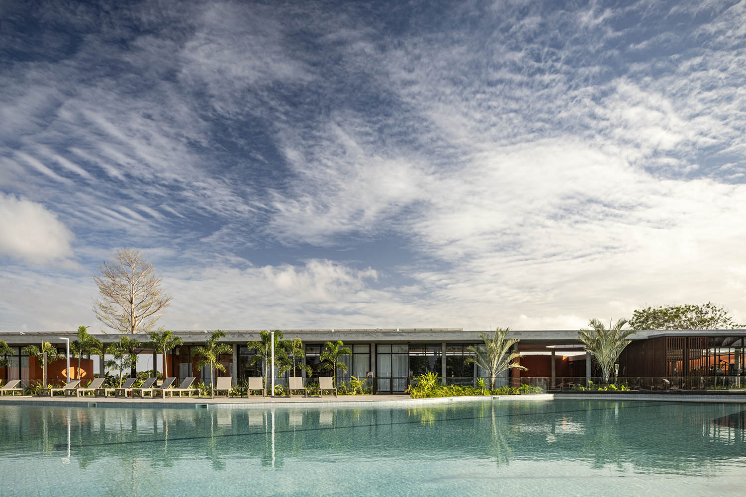 No clube, a laje em concreto aparente flutua sobre a própria massa. Sob ela, paredes sinuosas costuram os pilares, unindo vedação e estrutura. A cor terrosa evoca o solo nordestino e reforça o vínculo com a paisagem. A arquitetura se abre para a piscina de traços orgânicos, dissolvendo limites físicos e visuais. A transparência integra os interiores à paisagem.