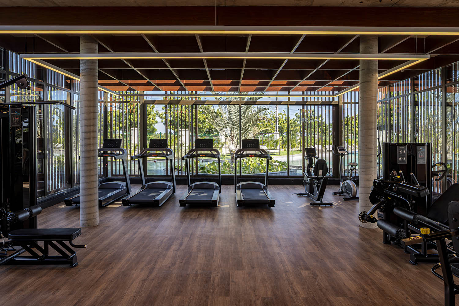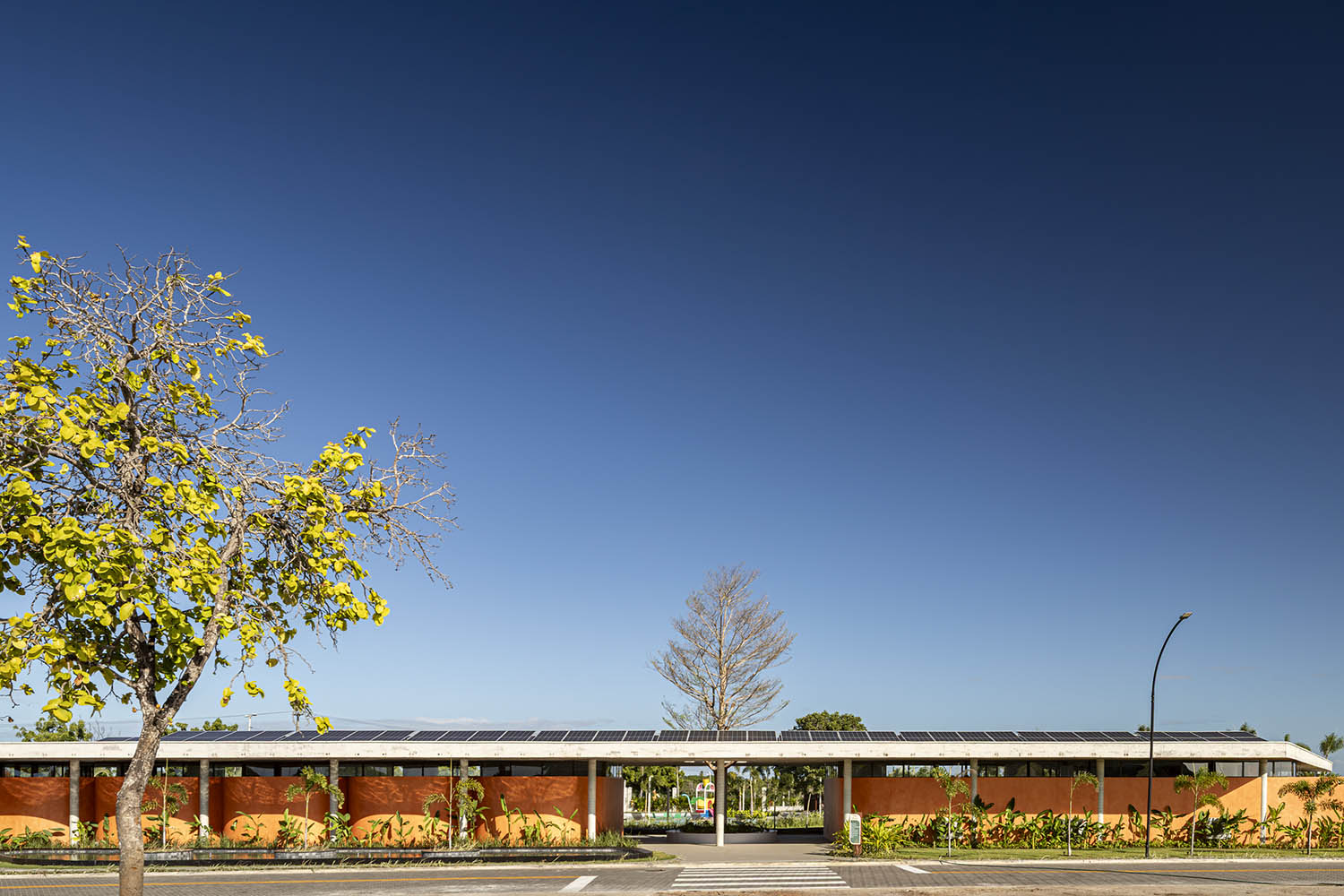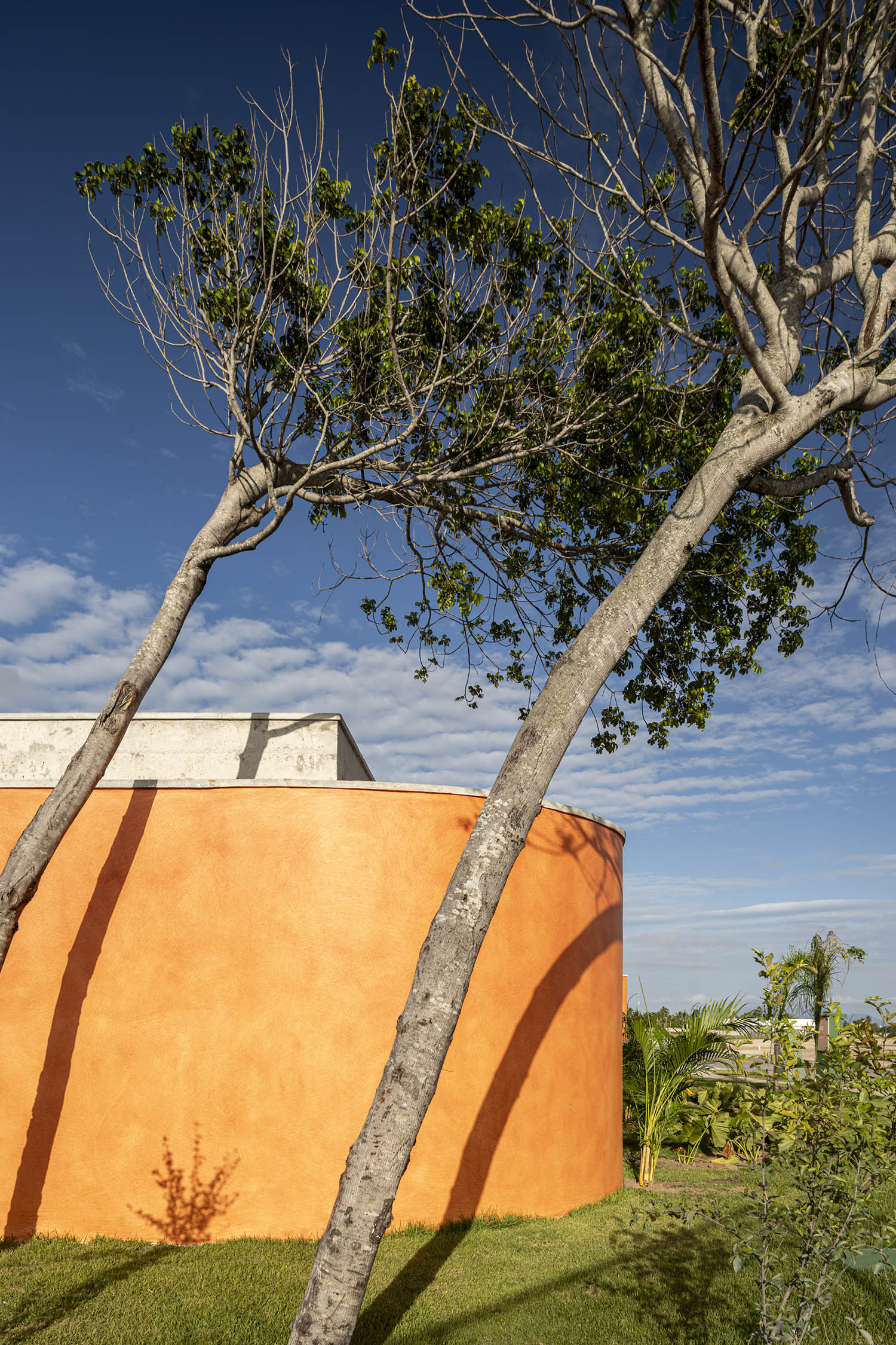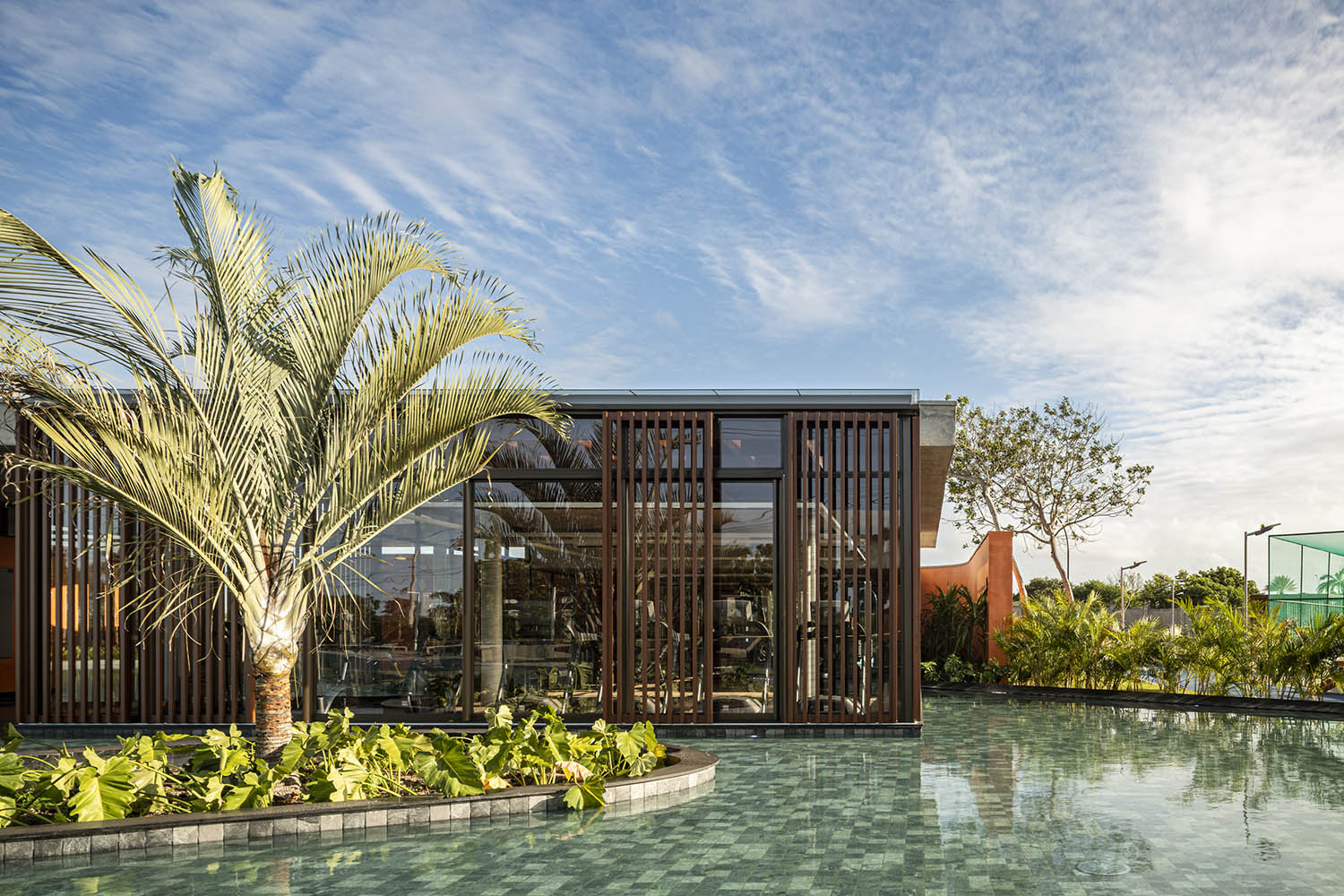 No clube, a laje em concreto aparente flutua sobre a própria massa. Sob ela, paredes sinuosas costuram os pilares, unindo vedação e estrutura. A cor terrosa evoca o solo nordestino e reforça o vínculo com a paisagem. A arquitetura se abre para a piscina de traços orgânicos, dissolvendo limites físicos e visuais. A transparência integra os interiores à paisagem.