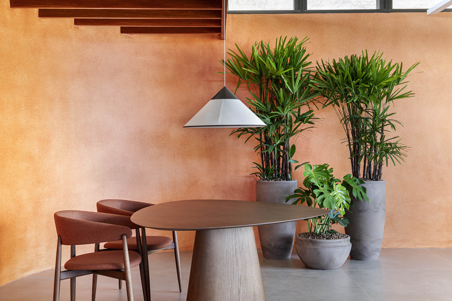 Nos ambientes internos, persistem os princípios de simplicidade, matéria natural e precisão. O mobiliário de design brasileiro define espaços acolhedores e funcionais. A arquitetura depura a complexidade até restar apenas o essencial: o inevitável.