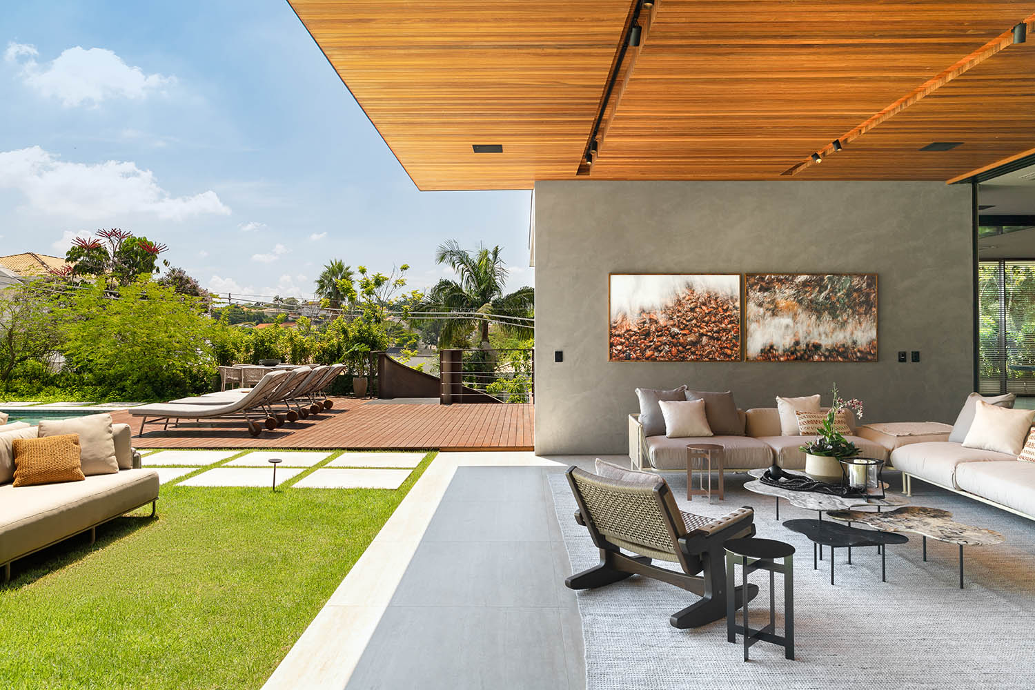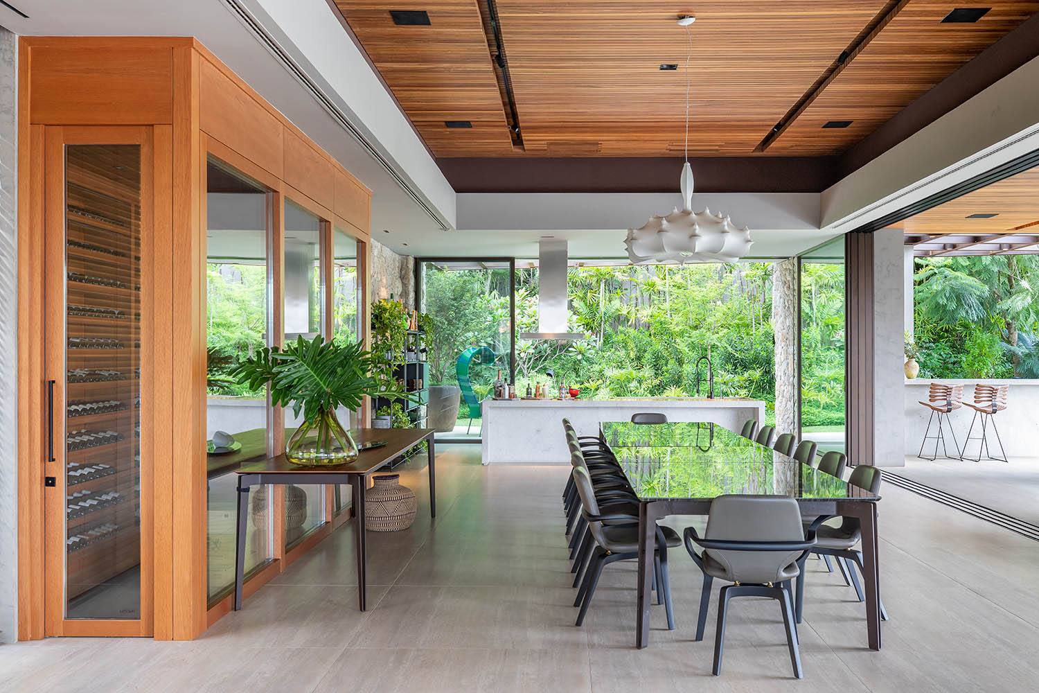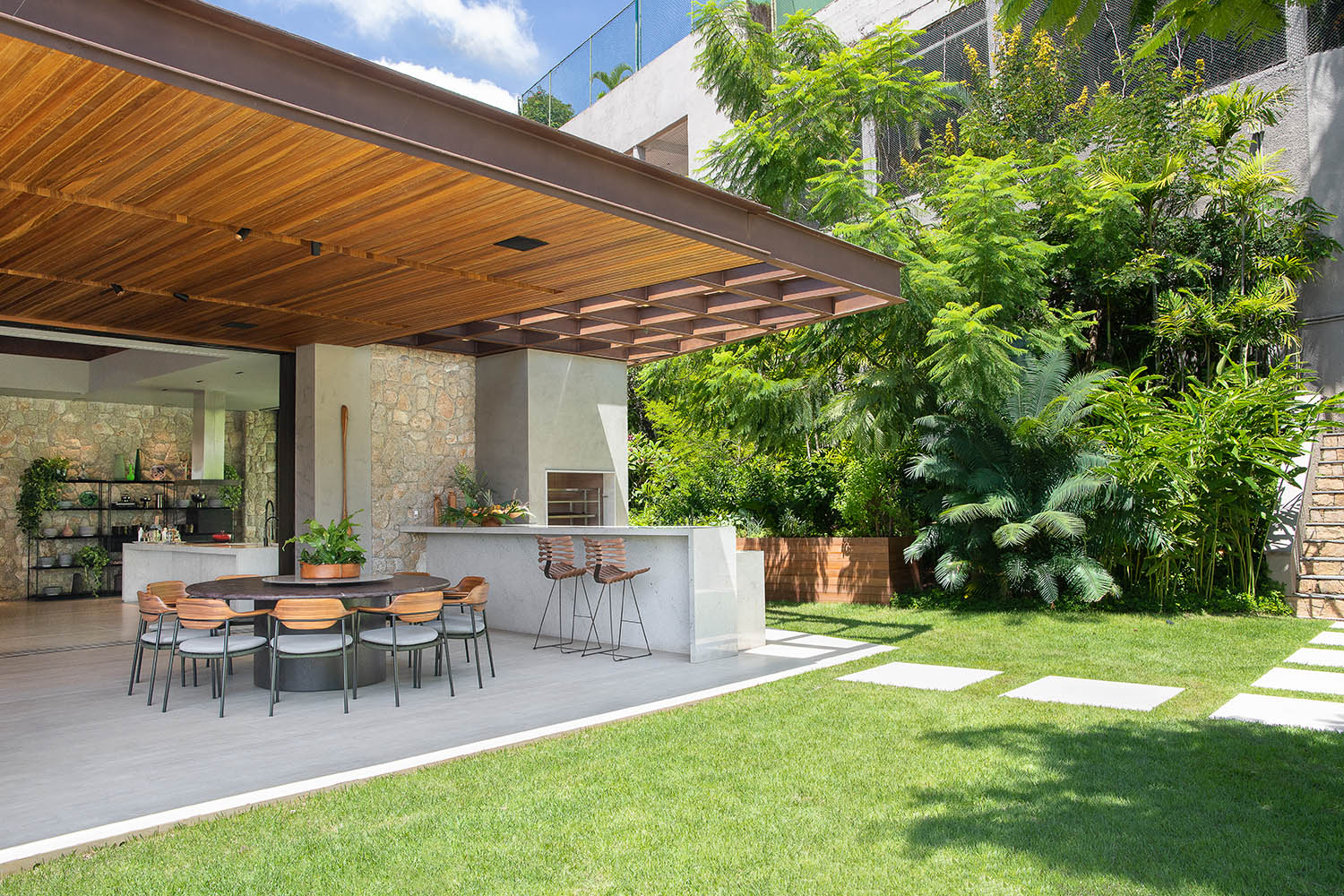 Concreto aparente, aço corten, vidro e madeira natural formam a paleta da casa. O social pulsa na grande sala integrada à varanda e ao bar, que se transforma em pista de dança. Contemplação e celebração se misturam em uma arquitetura de presença e afeto.