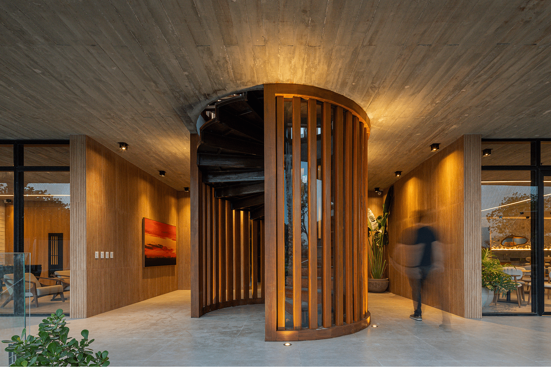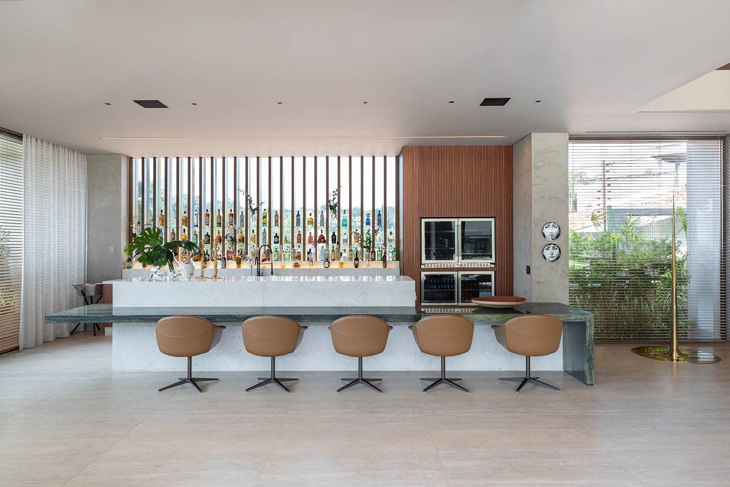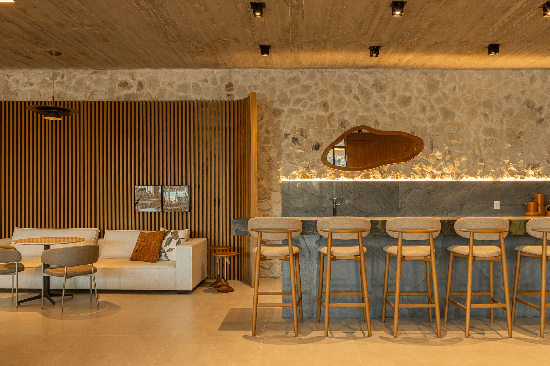 Concreto aparente, aço corten, vidro e madeira natural formam a paleta da casa. O social pulsa na grande sala integrada à varanda e ao bar, que se transforma em pista de dança. Contemplação e celebração se misturam em uma arquitetura de presença e afeto.