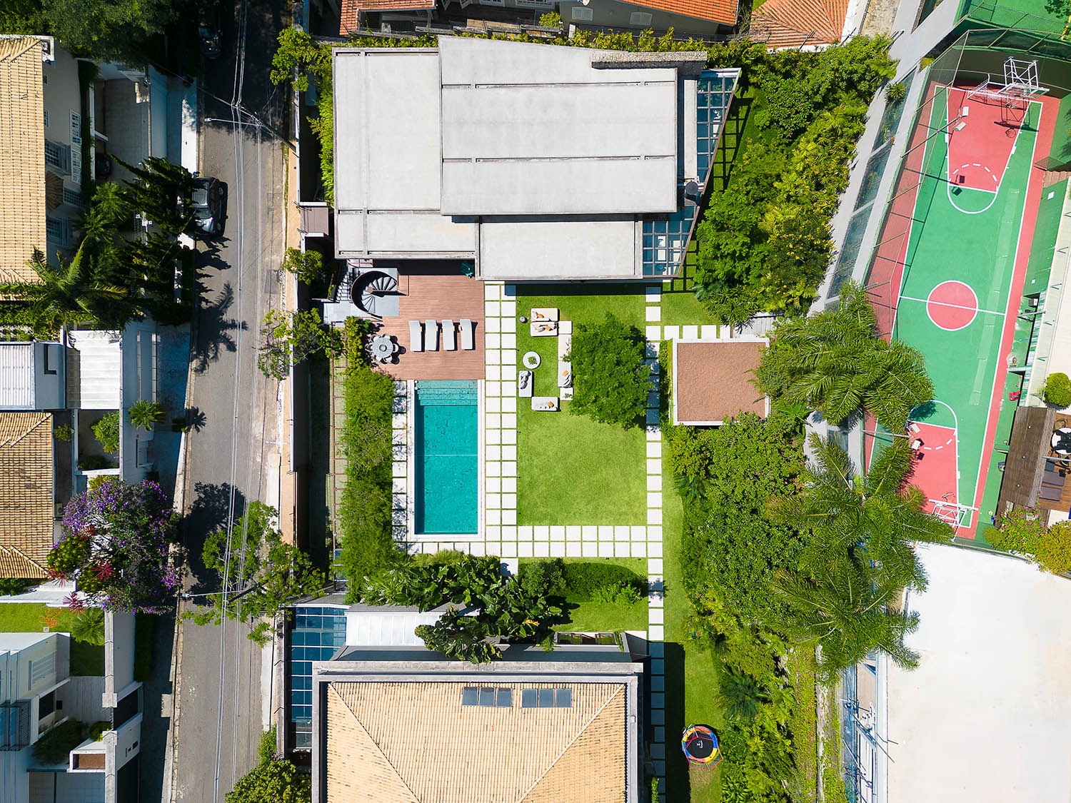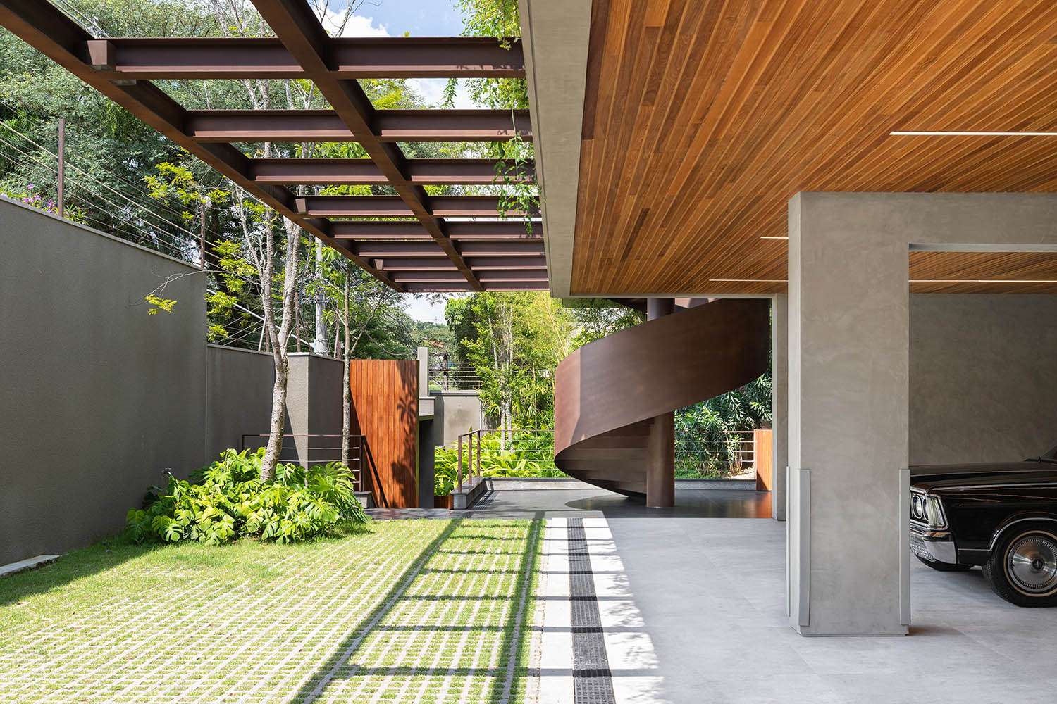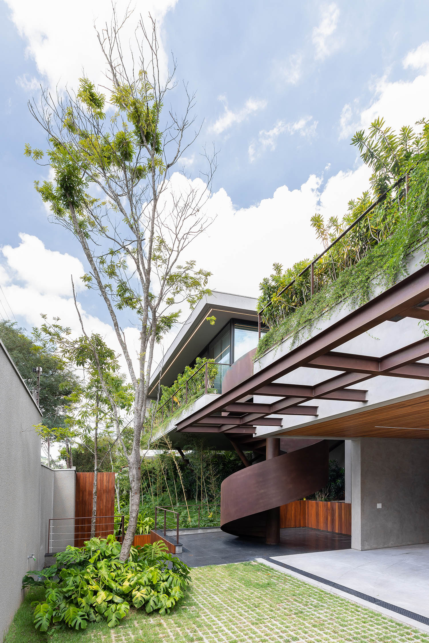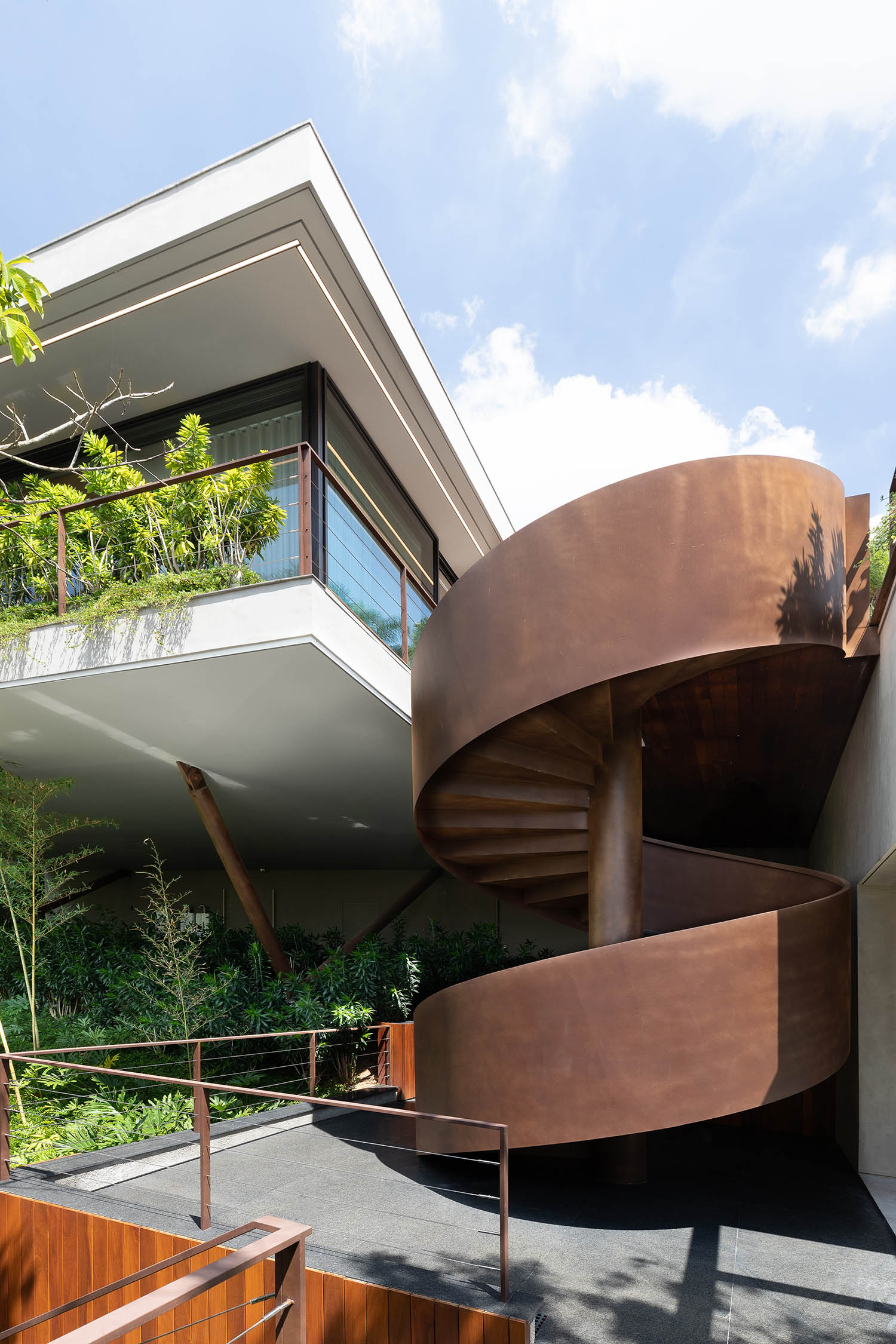 A nova edificação se apoia no ponto mais alto do platô, projetando-se sobre o vale em pilares metálicos em V. Para acessá-la, uma escada helicoidal em aço corten desenha uma espiral de leveza e força. No bairro de casas neoclássicas, o novo volume assume sua contemporaneidade. O contraste não gera conflito, mas potência.