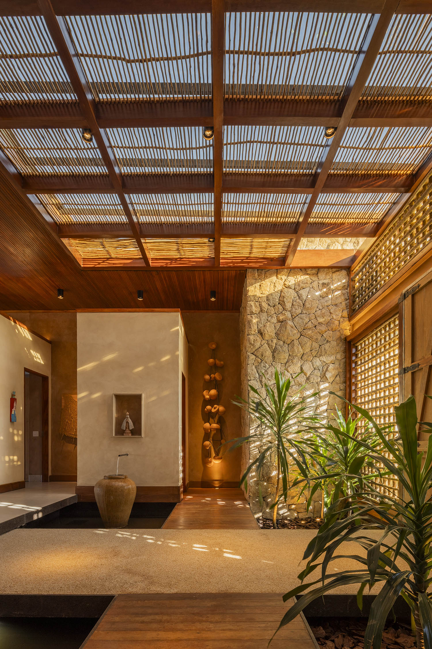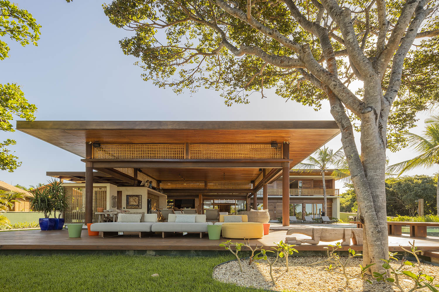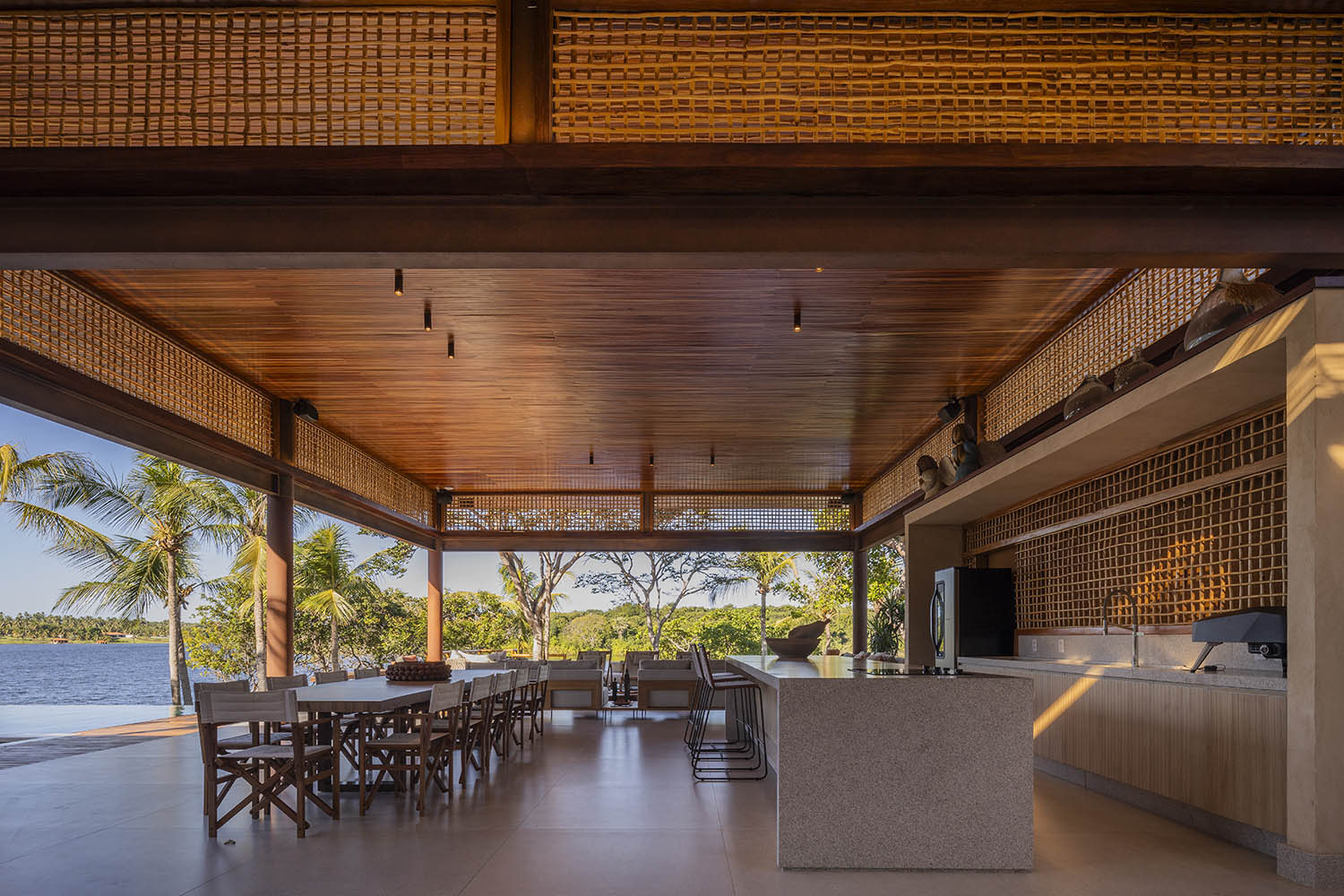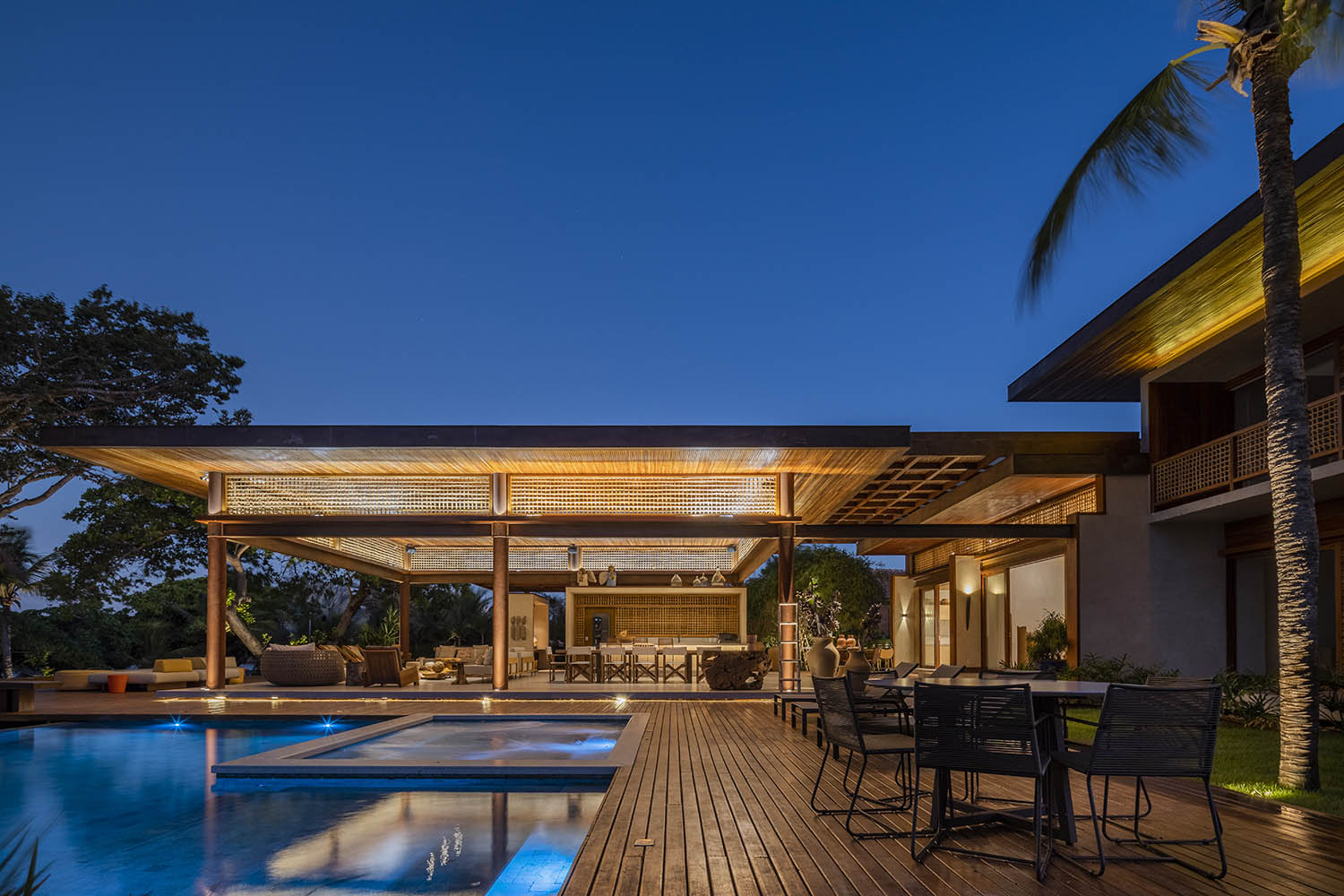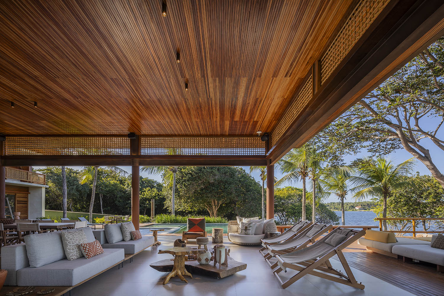 Organizada em blocos social, íntimo e de lazer, a casa se abre para a Lagoa do Uruaú, preservando a privacidade dos ambientes internos. Linhas contemporâneas se encontram com materiais locais como madeira, palhinha e muxarabis, que filtram a luz, garantem conforto térmico e constroem uma relação direta com a cultura cearense.