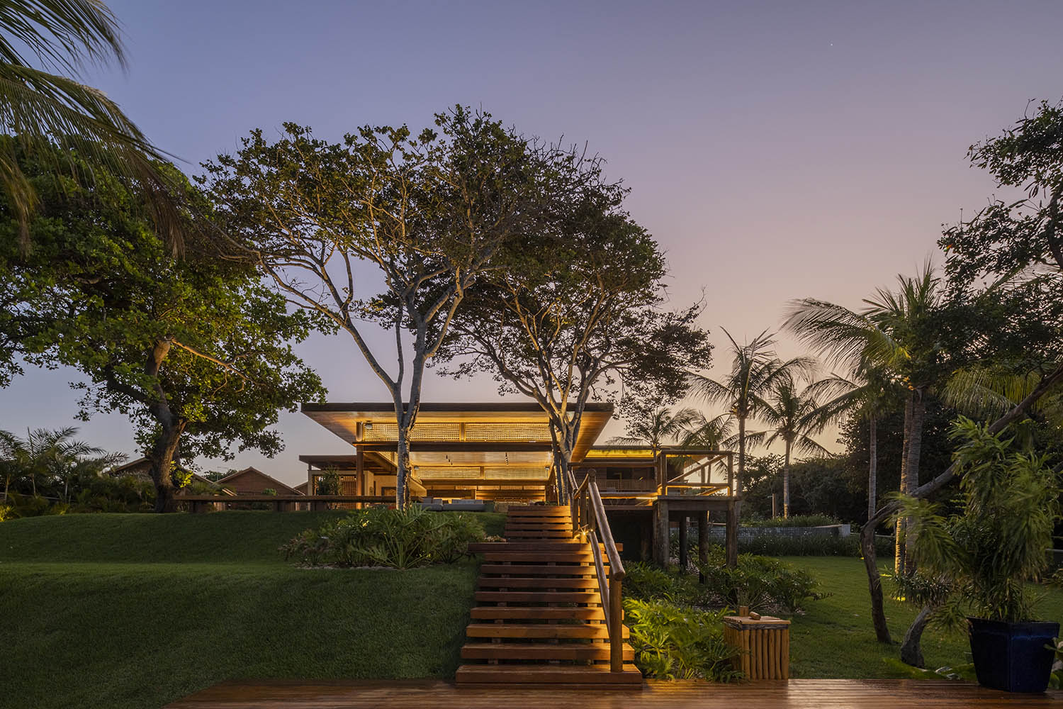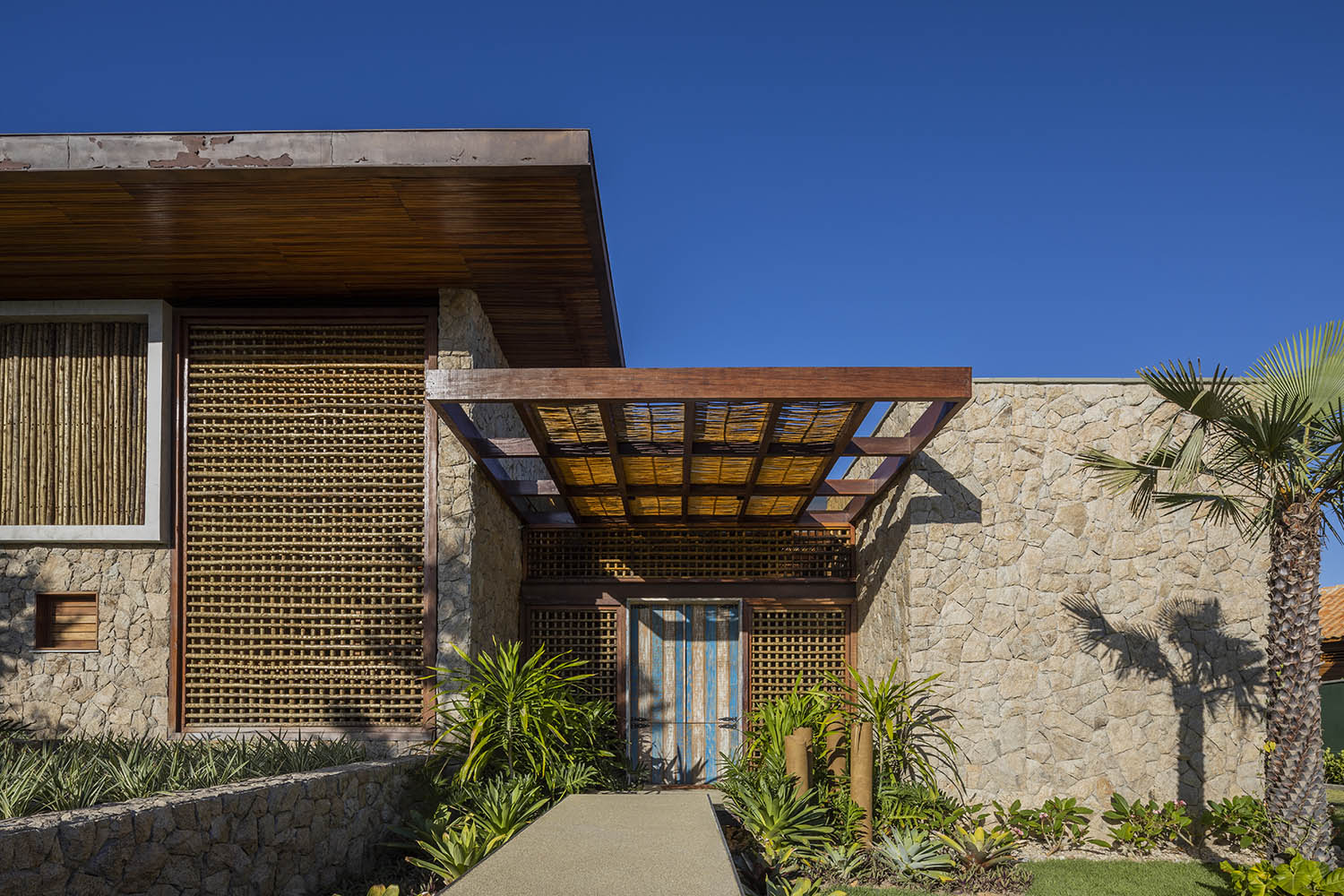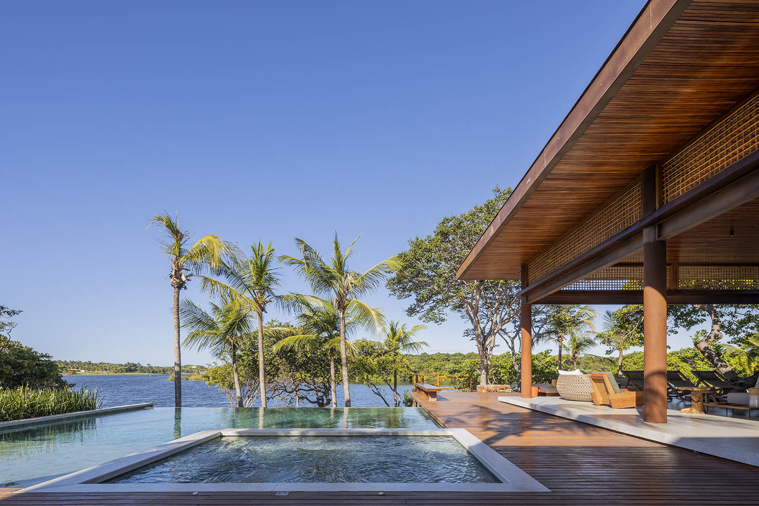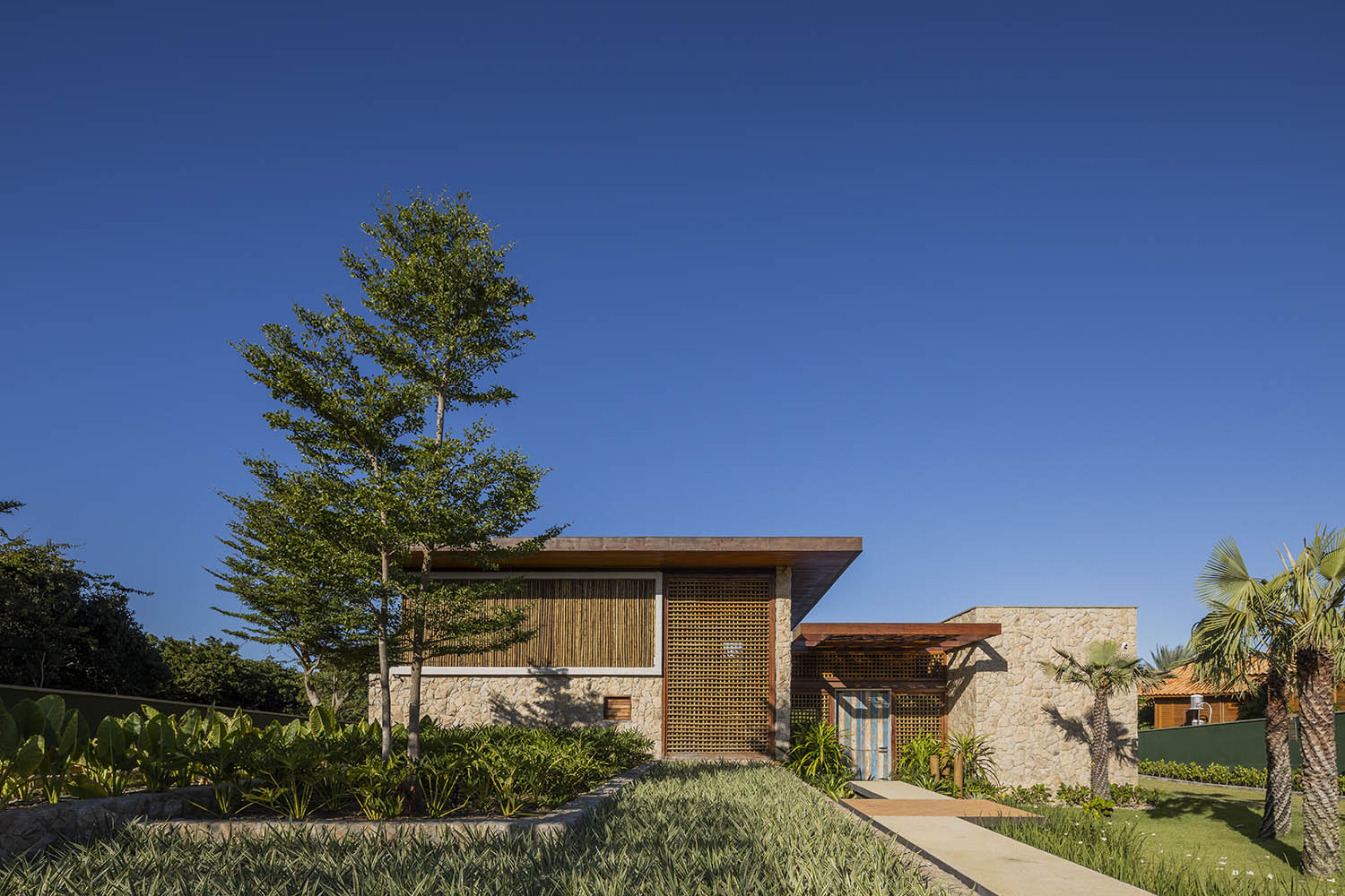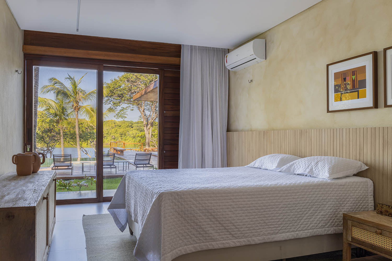 Organizada em blocos social, íntimo e de lazer, a casa se abre para a Lagoa do Uruaú, preservando a privacidade dos ambientes internos. Linhas contemporâneas se encontram com materiais locais como madeira, palhinha e muxarabis, que filtram a luz, garantem conforto térmico e constroem uma relação direta com a cultura cearense.