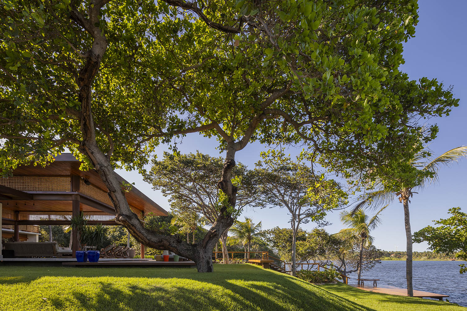 Nos interiores, a curadoria mescla design assinado, garimpos afetivos e arte popular. Cerâmicas, esculturas e objetos artesanais reforçam a identidade do projeto. Com ampla área de convivência, a casa acolhe decks, cozinha integrada e garagem para barco, equilibrando técnica e sensibilidade em diálogo com a paisagem.