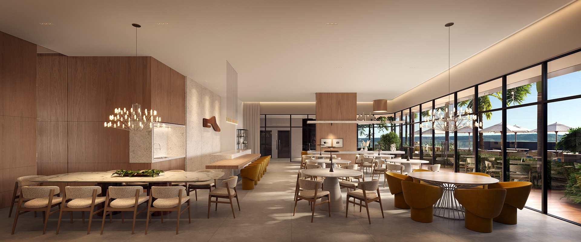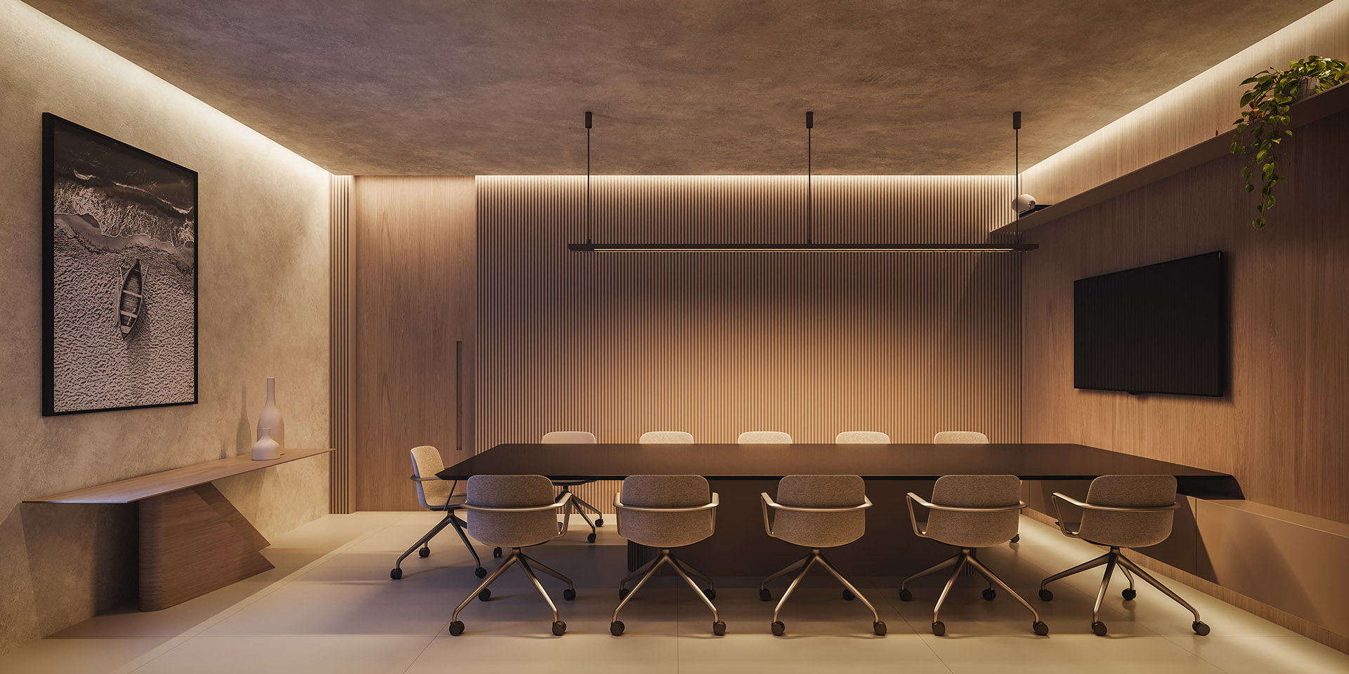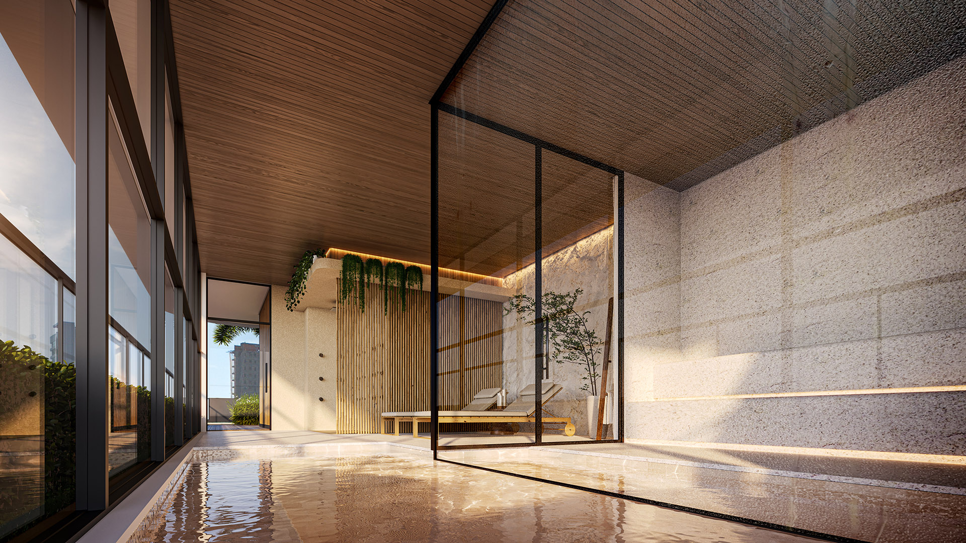 A fluidez da torre orientou a proposta dos interiores, que não seguem o minimalismo futurista, mas o interpretam com calidez e identidade. Apostamos em pedras naturais, revestimentos amadeirados e superfícies táteis para construir atmosferas acolhedoras e sensoriais, ancoradas na experiência do habitar.
