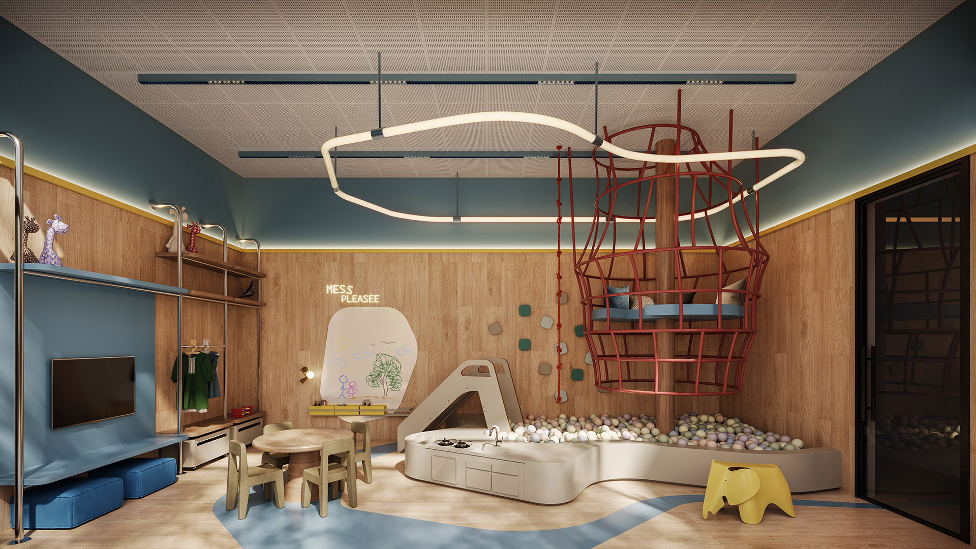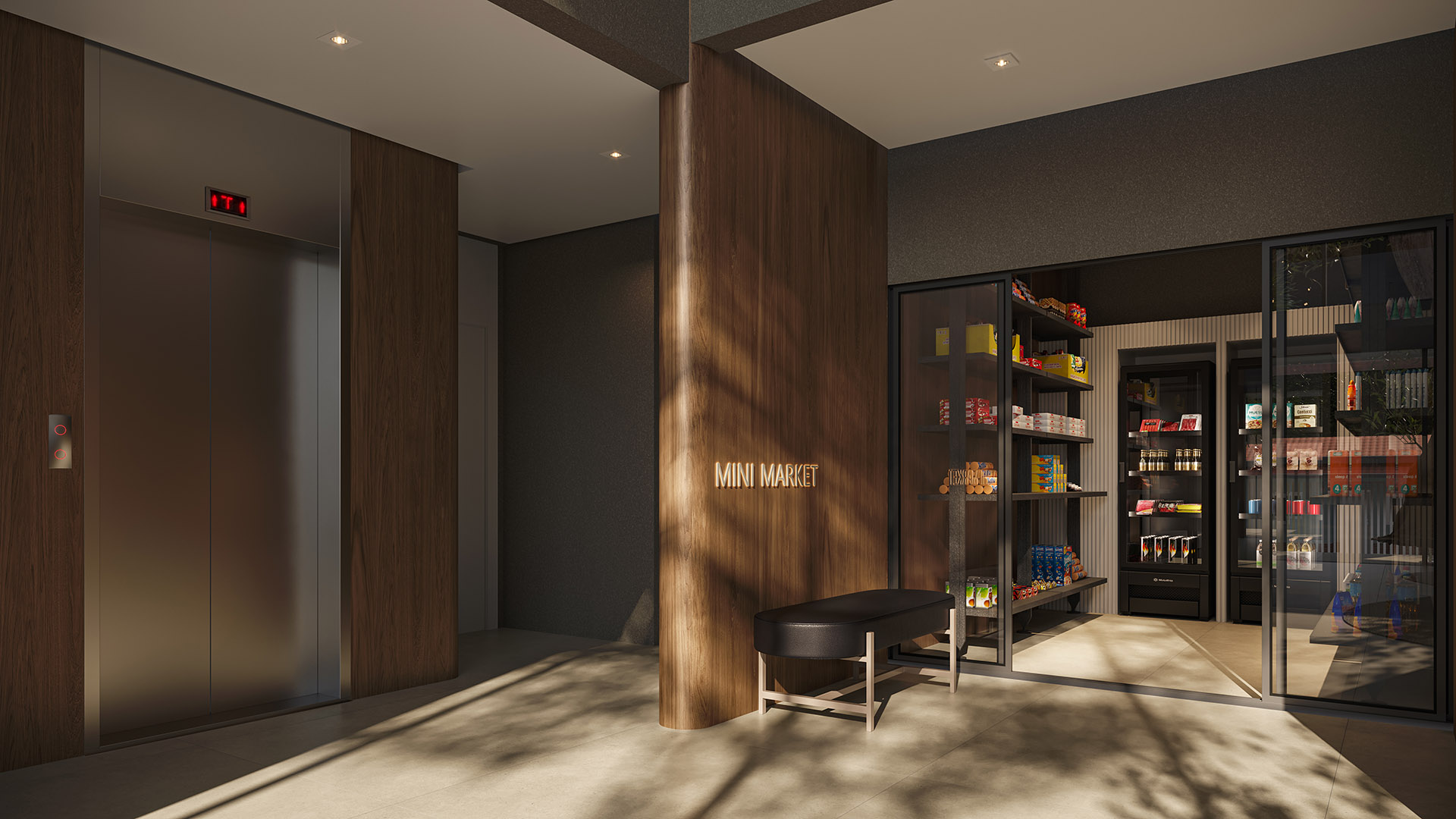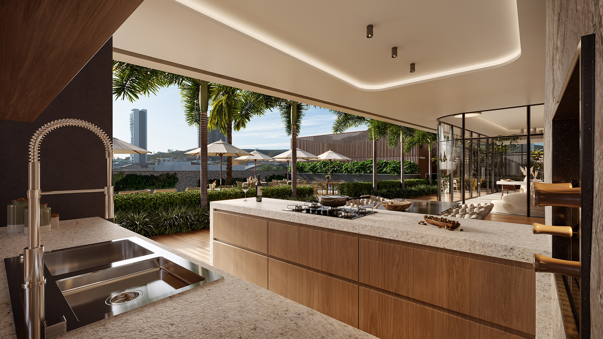 A fluidez da torre orientou a proposta dos interiores, que não seguem o minimalismo futurista, mas o interpretam com calidez e identidade. Apostamos em pedras naturais, revestimentos amadeirados e superfícies táteis para construir atmosferas acolhedoras e sensoriais, ancoradas na experiência do habitar.